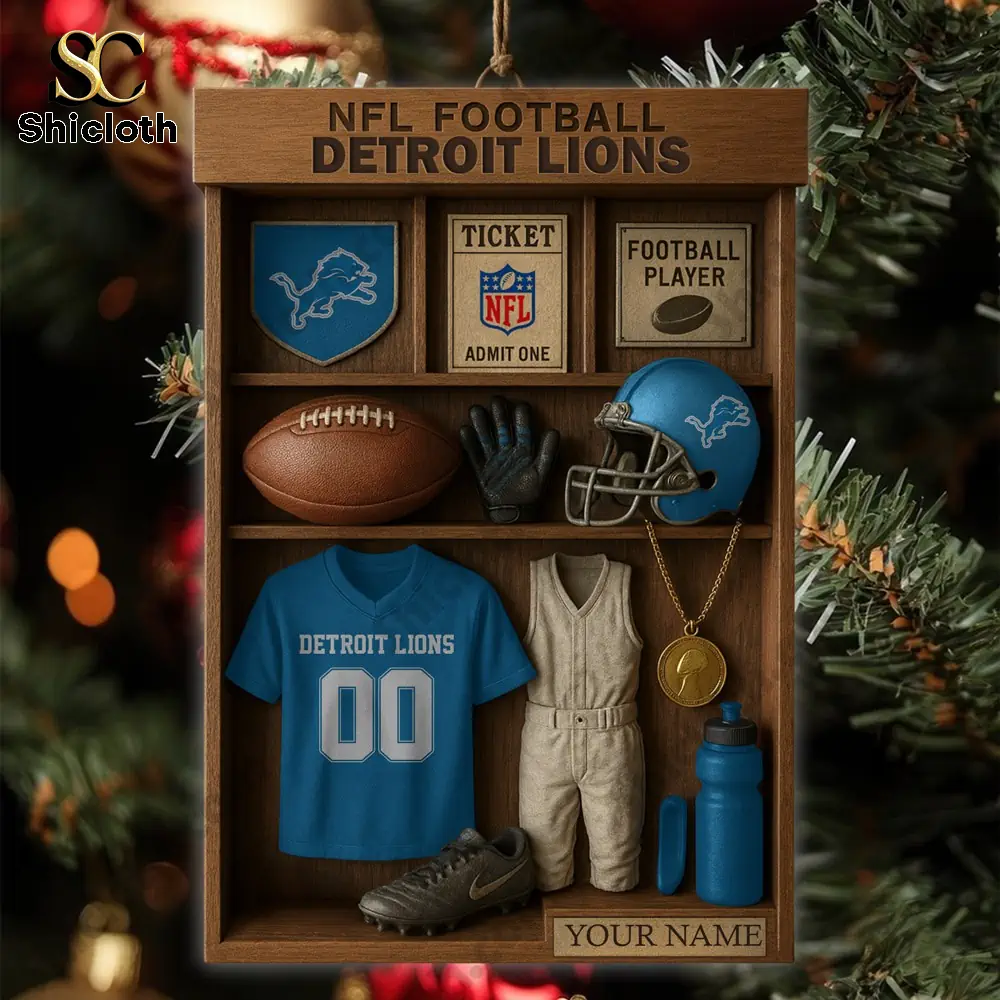 This unique ornament is designed to look like a classic wooden locker shelf, showcasing nine meticulously crafted football elements. Inside the light brown shelf, you’ll find tiny replicas of a blue Lions helmet, a miniature football, and a blue Detroit Lions jersey with the number ’00’ prominently displayed. Accompanying these are a protective shield bearing the Lions logo, a “Ticket Admit One” emblem, a “Football Player” tile, a tiny black glove, a beige vintage uniform, and a blue water bottle with a gold medal necklace. Every color is bright and vivid thanks to the single-sided, high-resolution UV printing. The most special feature? A small plaque at the bottom labeled “YOUR NAME” which makes this highly customizable and an unforgettable commemorative gift. This detailed piece is crafted from premium, hard-wearing acrylic with a substantial 1.5cm thickness, giving it a stable, high-end look and feel that resists discoloration for years.