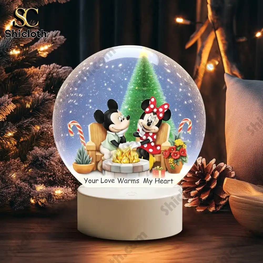 The Snowball LED Light is a centerpiece of pure wonder. It features Mickey and Minnie bundled up, sitting by a cozy fire pit under a glowing Christmas tree, surrounded by candy canes and small gifts. The base of the globe lights up, illuminating the sparkling scene and carrying the sweet message: “Your Love Warms My Heart”. This soft glow is perfect for creating a cozy atmosphere on a mantelpiece or side table. This set is a versatile gifting choice for all your loved ones, making it an ideal commemorative gift for special events or simply a magical addition to your own holiday decor. The option for personalization makes it even more special!