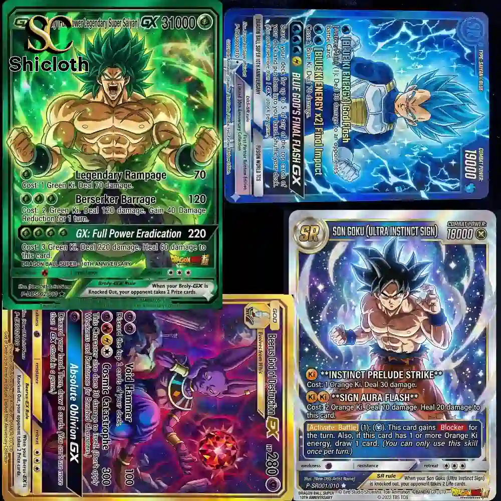 The standout feature of this collection is the gold-etched Akira Toriyama Memorial Card, which serves as a heartfelt tribute to the creator with the dates 1955–2024. This card features a dual-image design: a classic young Goku on his Flying Nimbus alongside a modern, powerful Ultra Instinct version. The cards are crafted from premium metallic-finish cardstock and high-grade PVC, ensuring they are resistant to bending and fading. You will notice intricate details such as the “Combat Power: ∞” symbol, rainbow holographic foil edges, and the official 10th-anniversary logo placed at the bottom center. The vibrant color palette ranges from deep forest greens for Broly’s “Legendary Rampage” card to celestial blues and purples for the “Absolute Oblivion GX” Beerus card.