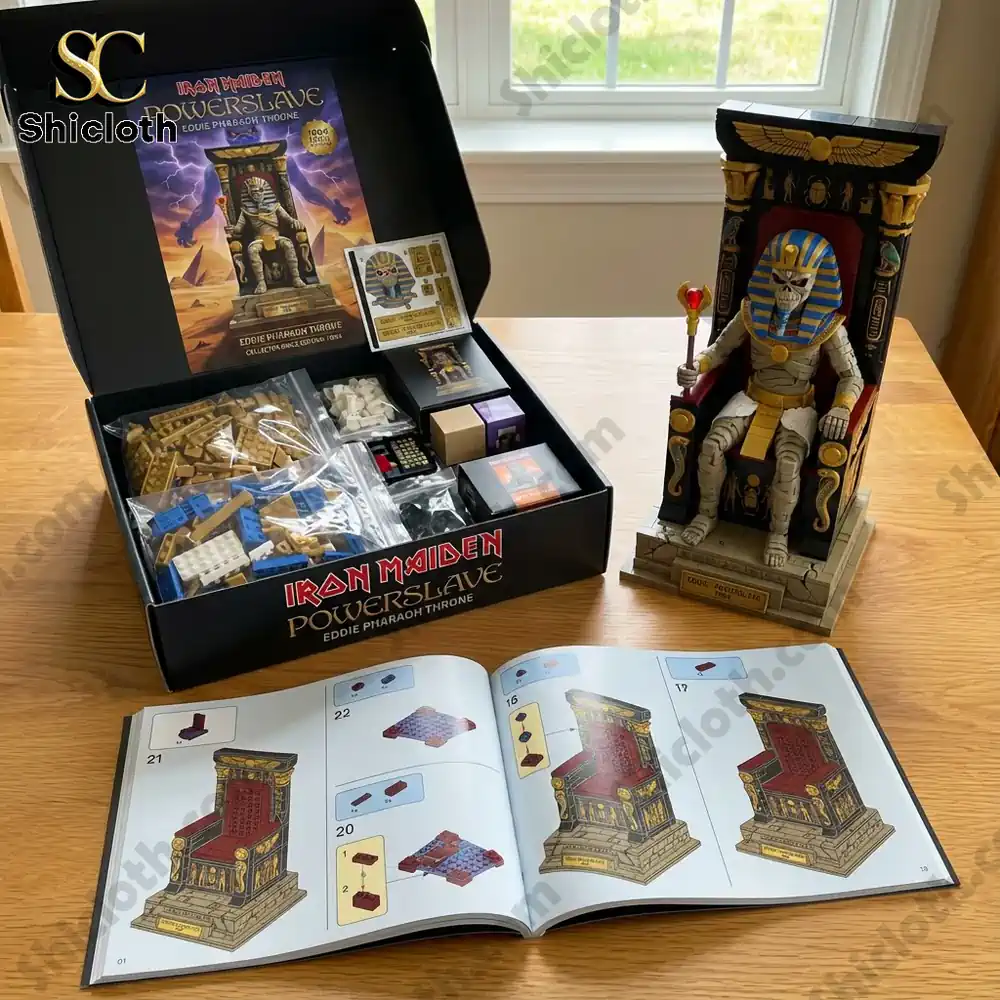 This impressive set features Eddie seated on a majestic, hieroglyphic-adorned throne atop a weathered, stone-textured base. The design is rich with vibrant colors, specifically the signature Egyptian blue and gold stripes on Eddie’s pharaoh headdress. Every detail is meticulously represented, from the crimson jewel atop his golden scepter to the intricate scarab and bird motifs flanking the back of the throne. The model is crafted from a durable blend of high-quality ABS-style bricks, ensuring a sturdy display piece that remains stable once assembled. For those who enjoy the building process, the kit includes a clear, step-by-step instruction manual that guides you through every layer of the throne’s architecture and Eddie’s bandaged form.