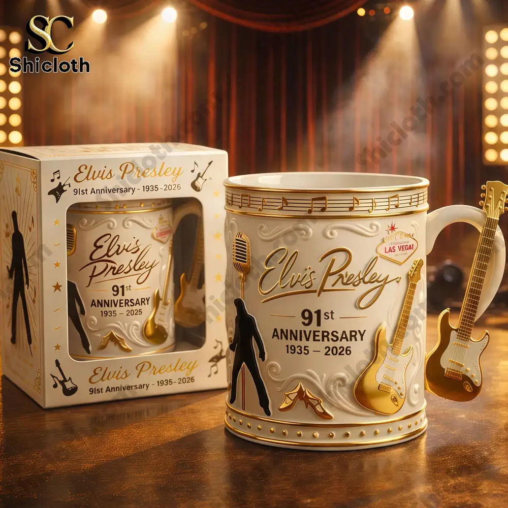 This commemorative mug is the ultimate tribute to the King of Rock ‘n’ Roll, celebrating Elvis Presley’s 91st anniversary (1935–2026). Designed with a luxurious white and gold aesthetic, it features high-relief 3D details including Elvis’s signature, a golden electric guitar, and his iconic silhouette. This high-quality ceramic piece is perfect for fans looking to blend musical history with their daily coffee routine.
