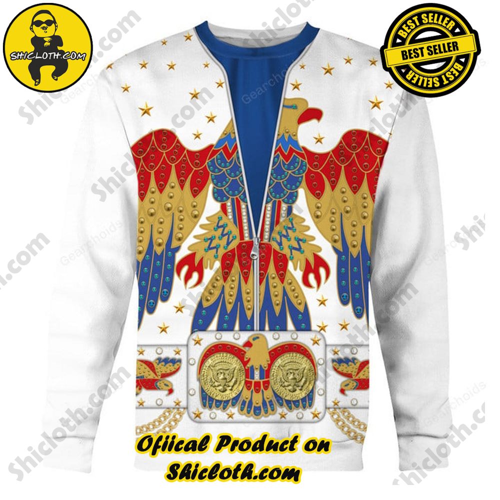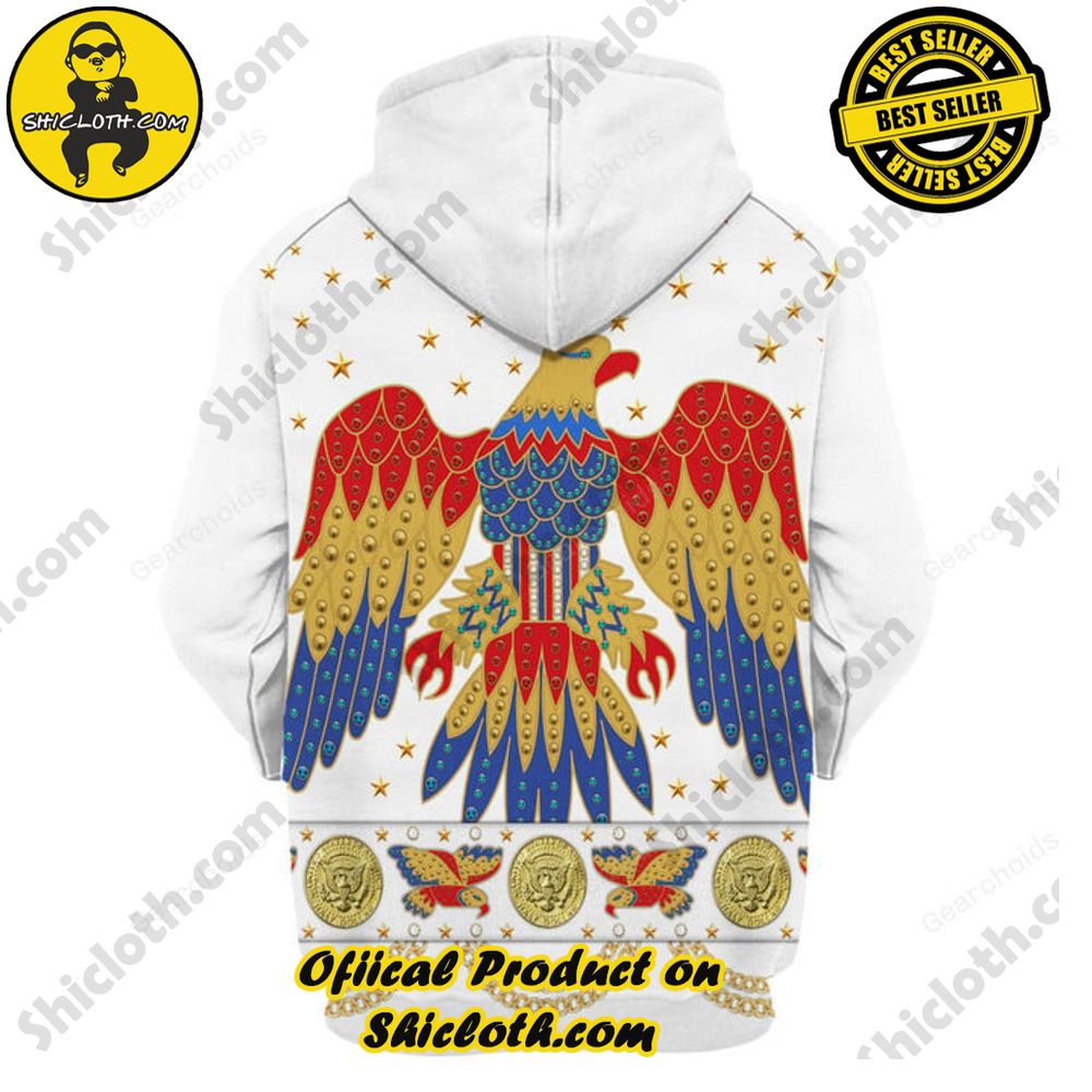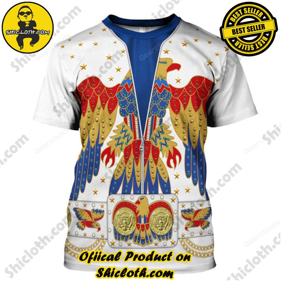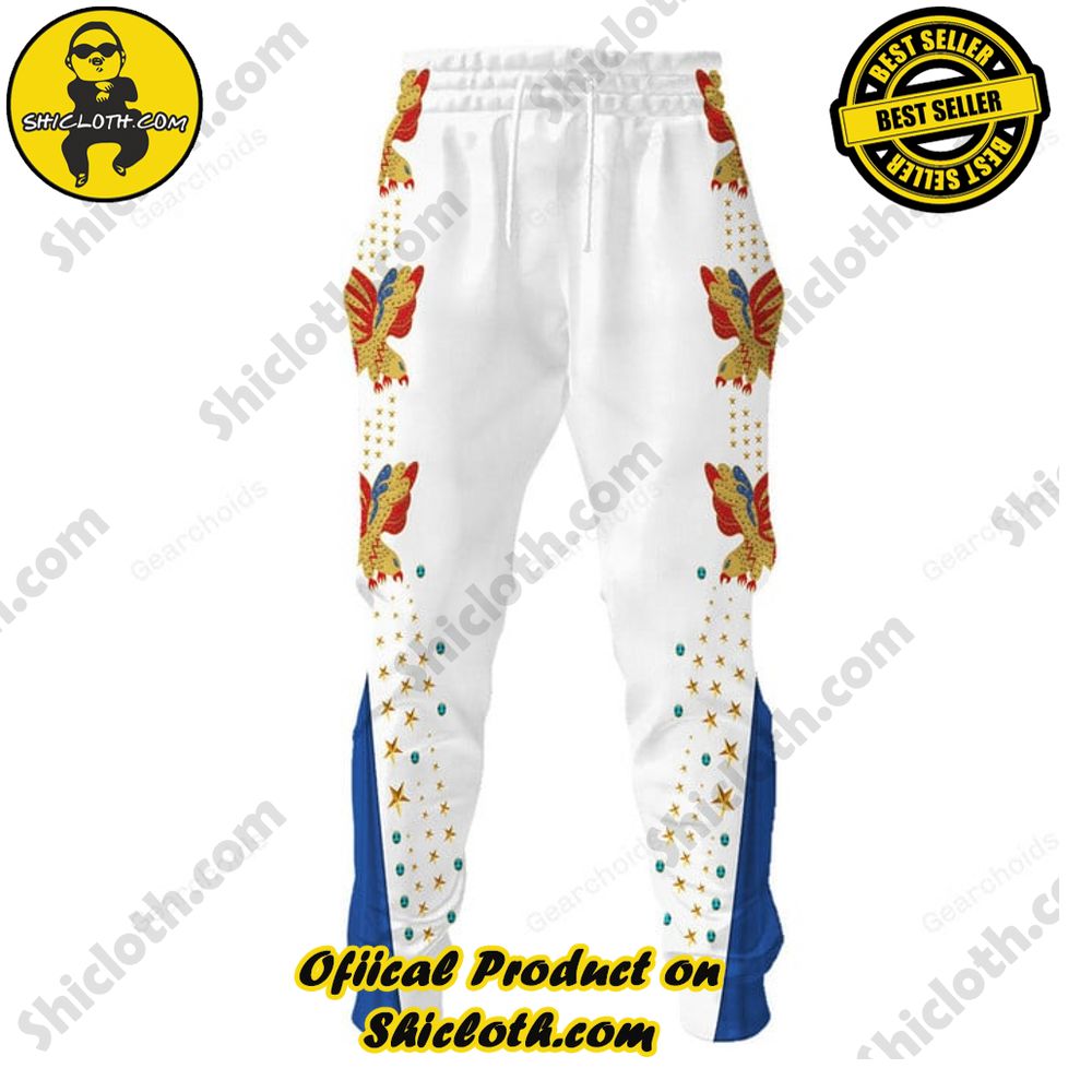 Crafted with precision, this hoodie sweatshirt, t-shirt, and sweatpants set features the iconic Elvis EAGLE costume design, paying homage to his legendary stage presence and electrifying performances. The vibrant colors and intricate details replicate the legendary outfit worn by Elvis, allowing you to channel his charisma and style whenever you wear it.