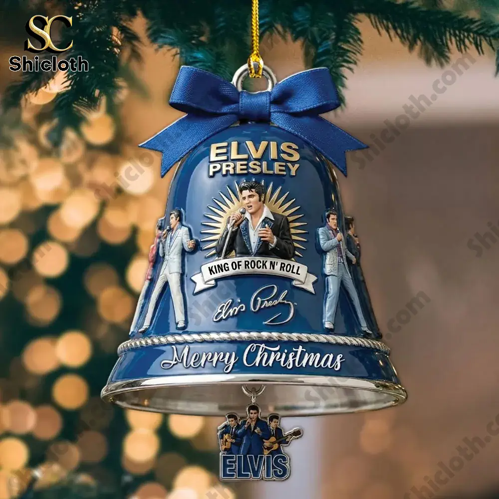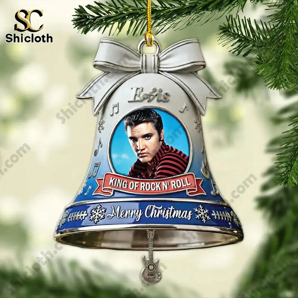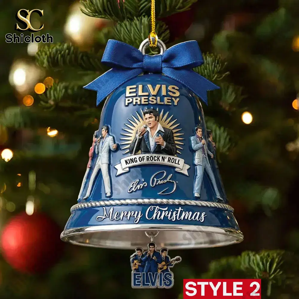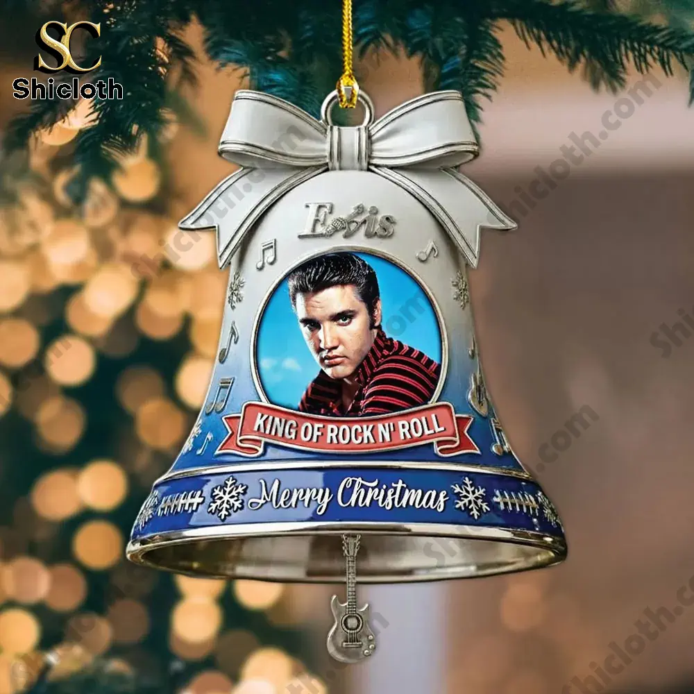 Style 1 (The Classic Portrait): This silver and blue bell showcases a striking central portrait of a young Elvis in a red and black striped shirt. The design is framed by musical notes, snowflakes, and the text “Elvis,” “KING OF ROCK N’ ROLL,” and “Merry Christmas.” It is beautifully topped with a silver bow and features a small, metallic guitar charm dangling from the bottom.