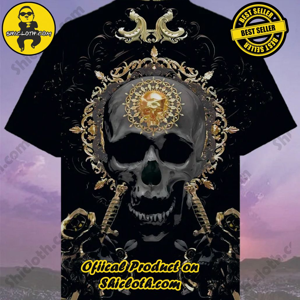 Best Places to Buy Eye-Catching King’s Vintage Court Golden Skull Printing Cuban Collar Hawaiian Short Sleeve Shirt Online:
