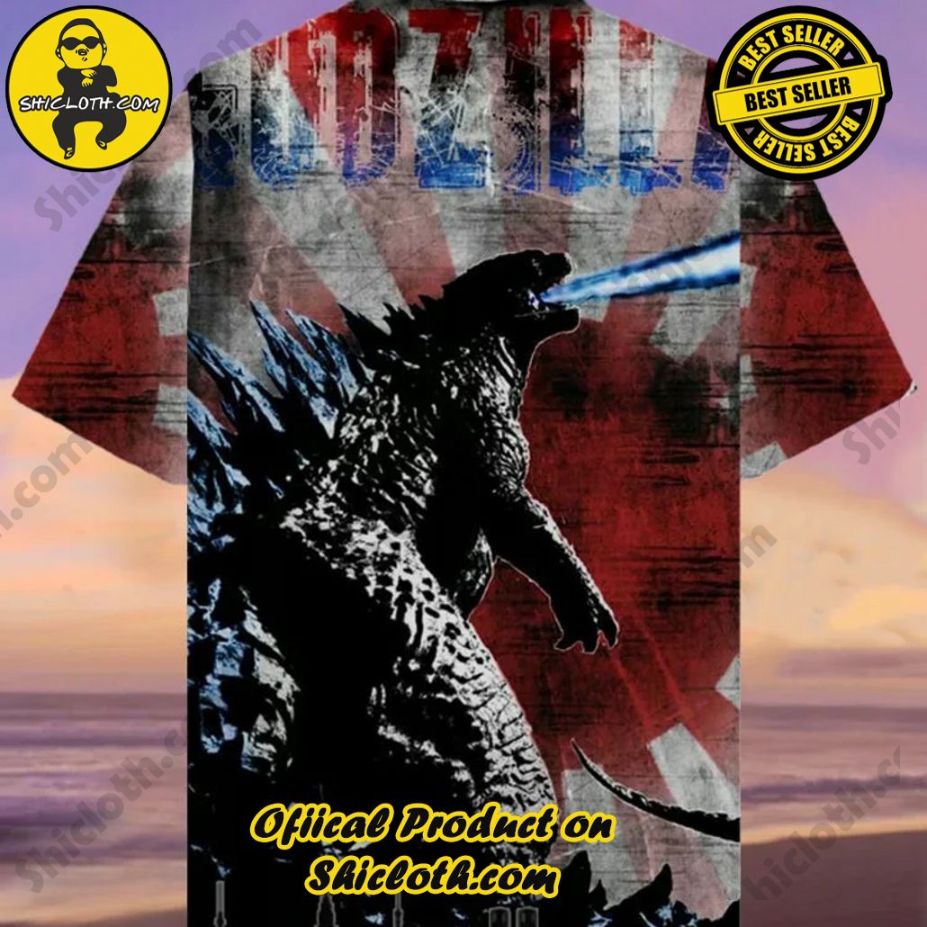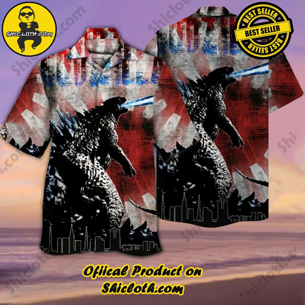 Eye-Catching Vintage Wall Painting American Flag And Thunder Godzilla Printing Cuban Collar Hawaiian Short Sleeve Shirt