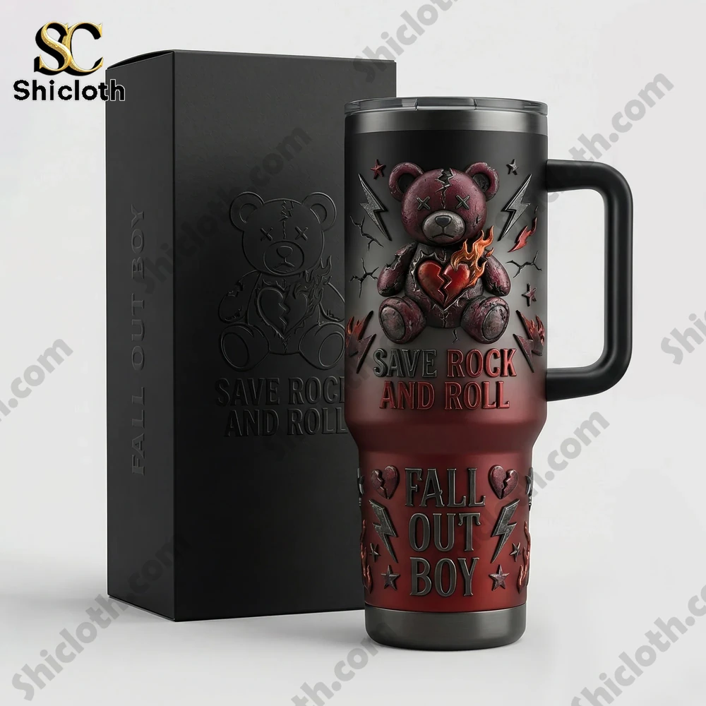 This Fall Out Boy Save Rock and Roll tumbler is the ultimate accessory for any fan looking to combine their love for the band with a high-quality, functional drinkware piece. Featuring a bold double-walled inox stainless steel construction, this tumbler is designed to keep your favorite beverages icy cold during summer beach trips or steaming hot during chilly winter mornings. The design is a visual tribute to the iconic era, showcasing a 3D-effect distressed teddy bear with a flaming heart at the center, surrounded by lightning bolts and stars. The color palette transitions beautifully from a deep charcoal black at the top to a rich, metallic crimson red at the base, creating a rugged, rock-inspired aesthetic.