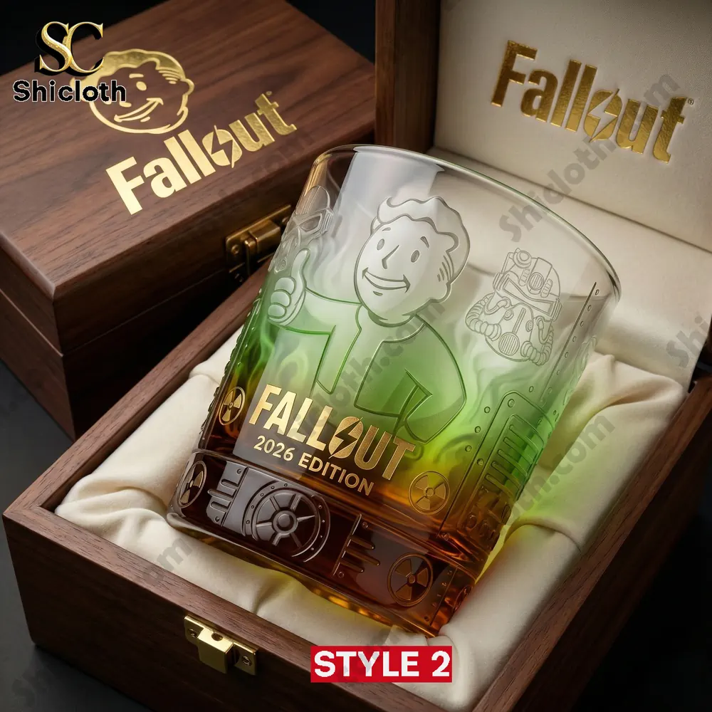 If you are looking to level up your home bar with a piece of the Wasteland, the Fallout T-51 Power Armor Wasteland Collector Whiskey Glass is the ultimate loot. This premium glassware comes in two distinct designs, both housed in a luxurious wooden collector box lined with white satin. Style 1 features a heavy, 3D embossed T-51 Power Armor suit as the centerpiece, flanked by mini nukes, gears, and the iconic “War Never Changes” quote. Style 2 offers a vibrant, radioactive aesthetic with a Vault Boy thumbs-up graphic over a translucent green and amber gradient, finished with a heavy base featuring embossed Vault-Tec door patterns.