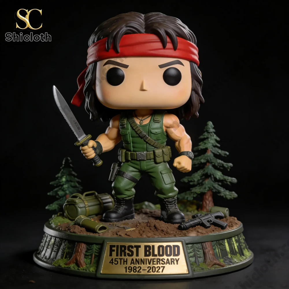 This collector’s set features a high-quality vinyl figure of John Rambo, instantly recognizable by his signature red headband and weathered survival gear. He is depicted in his classic olive green tactical vest and cargo pants, holding his iconic serrated survival knife. The figure stands on a meticulously crafted 45th-anniversary base that simulates a forest floor, complete with miniature pine trees, a discarded green duffel bag, and a small-scale rifle. The base is finished with a gold-tone plaque inscribed with “First Blood 45th Anniversary 1982-2027”, making it a time-stamped treasure for long-term fans. Every detail, from the muscular sculpt of the arms to the determined expression, is designed to evoke the grit of the original film.