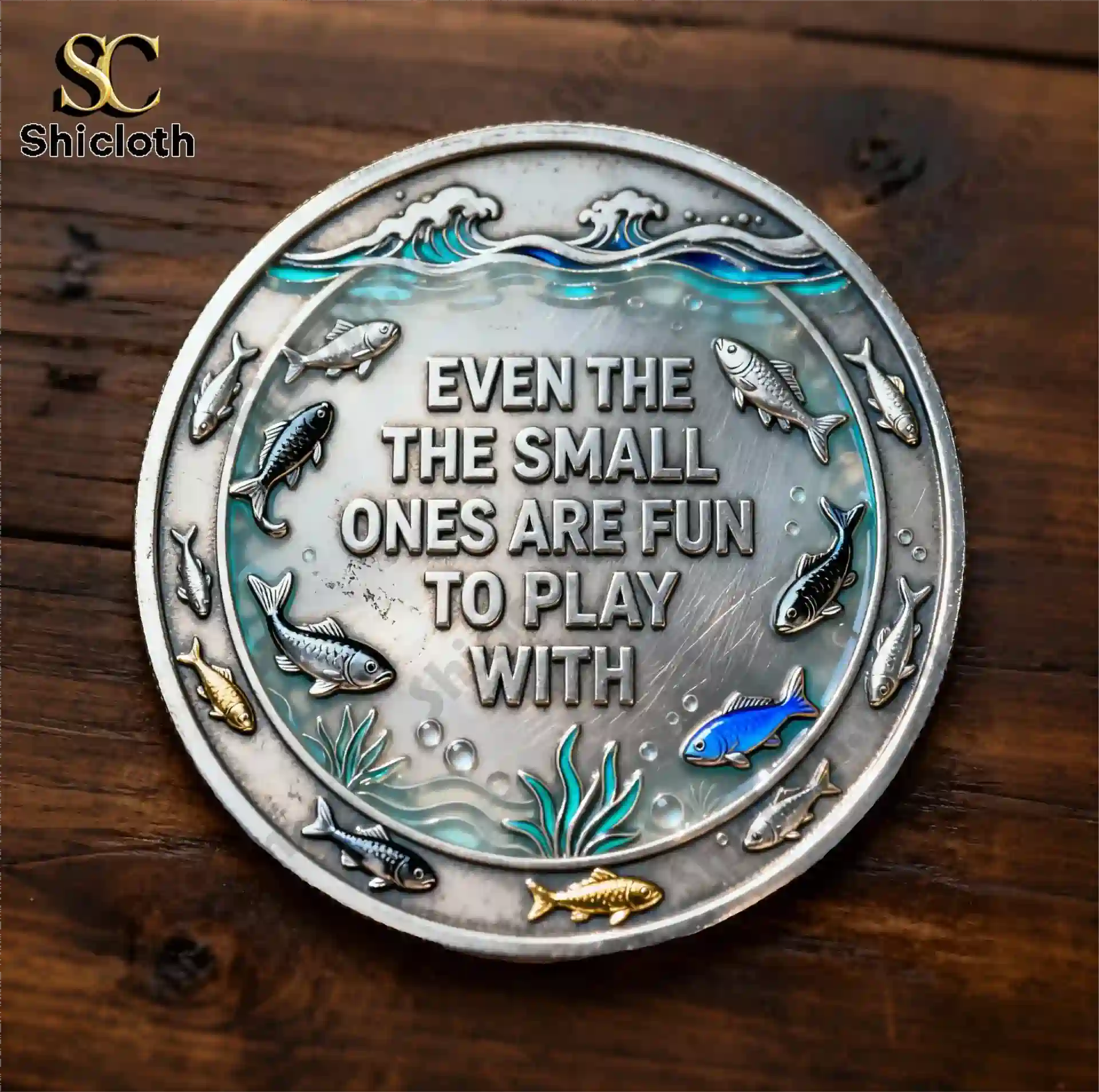 This coin features a striking design with vibrant colors and intricate textures. On the front, you will find the bold text FISHING IS LIKE BOOBS arched over a black silhouette of a fisherman triumphantly holding up his catch. The background is beautifully detailed with a blue and gold enameled lake scene and distant mountains. Flip it over to find the humorous punchline, EVEN THE SMALL ONES ARE FUN TO PLAY WITH, surrounded by a detailed underwater scene featuring various fish species, bubbles, and aquatic plants. The entire edge of the coin is lined with a border of small silver fish, adding a sophisticated touch to the overall playful theme.