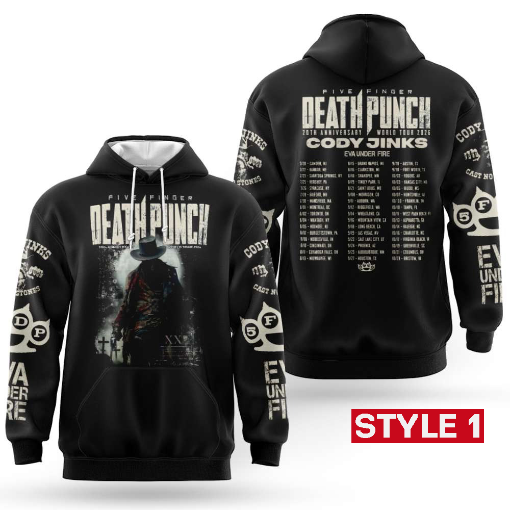 The Five Finger Death Punch 20th Anniversary World Tour 2026 Hoodie is a premium piece of fan gear celebrating two decades of heavy metal excellence. This collection features two distinct colorways: Style 1 in a classic deep black and Style 2 in a sharp white and black contrast. Each hoodie is designed with high-quality dye-sublimation printing that ensures the intricate tour graphics—including the iconic cowboy figure and the full 2026 tour date list—remain vibrant and crack-free after every wash.