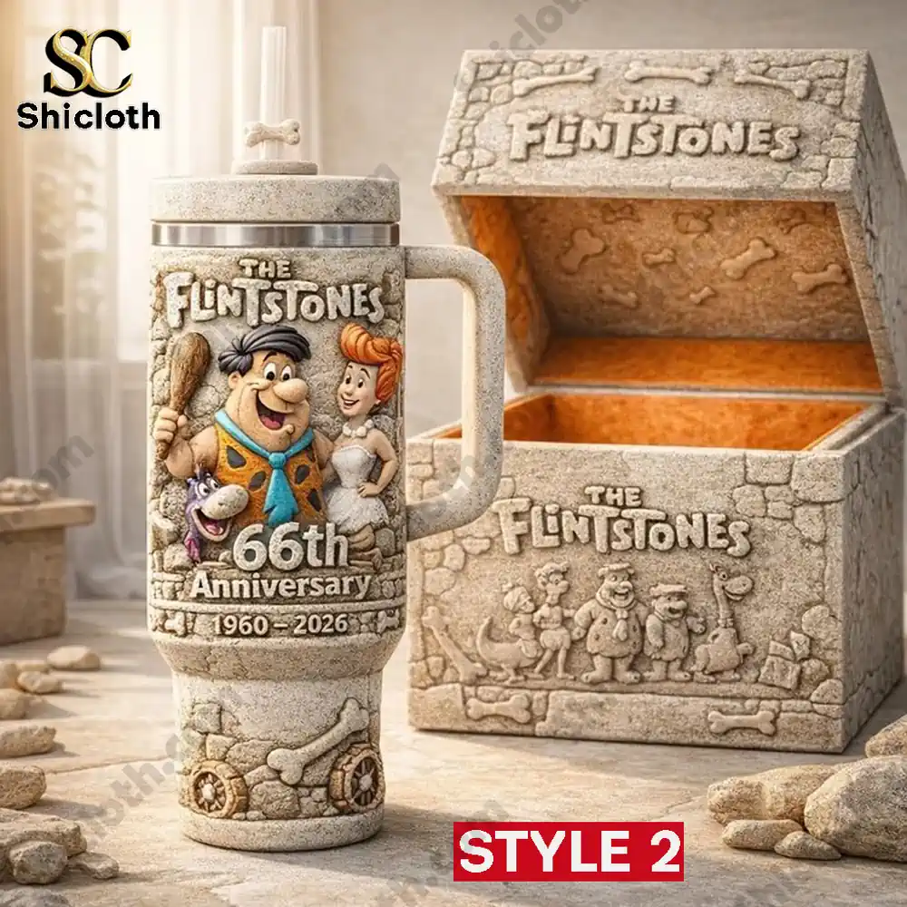 For a more playful vibe, Style 2 brings the characters to life with hand-painted color accents on a textured grey stone background. This version prominently displays Fred in his orange spotted tunic and Wilma in her white dress, alongside the “66th Anniversary 1960-2026” inscription. Notable tiny details include bone-shaped lid accents and a base designed to look like the primitive wooden wheels of a prehistoric vehicle. To keep your tumbler pristine, we recommend hand washing only to protect the intricate 3D textures. This durable, BPA-free material ensures your drinks stay cold during summer BBQs or warm during cozy cartoon marathons, offering a heavy-duty feel that fits perfectly in most car cup holders.
