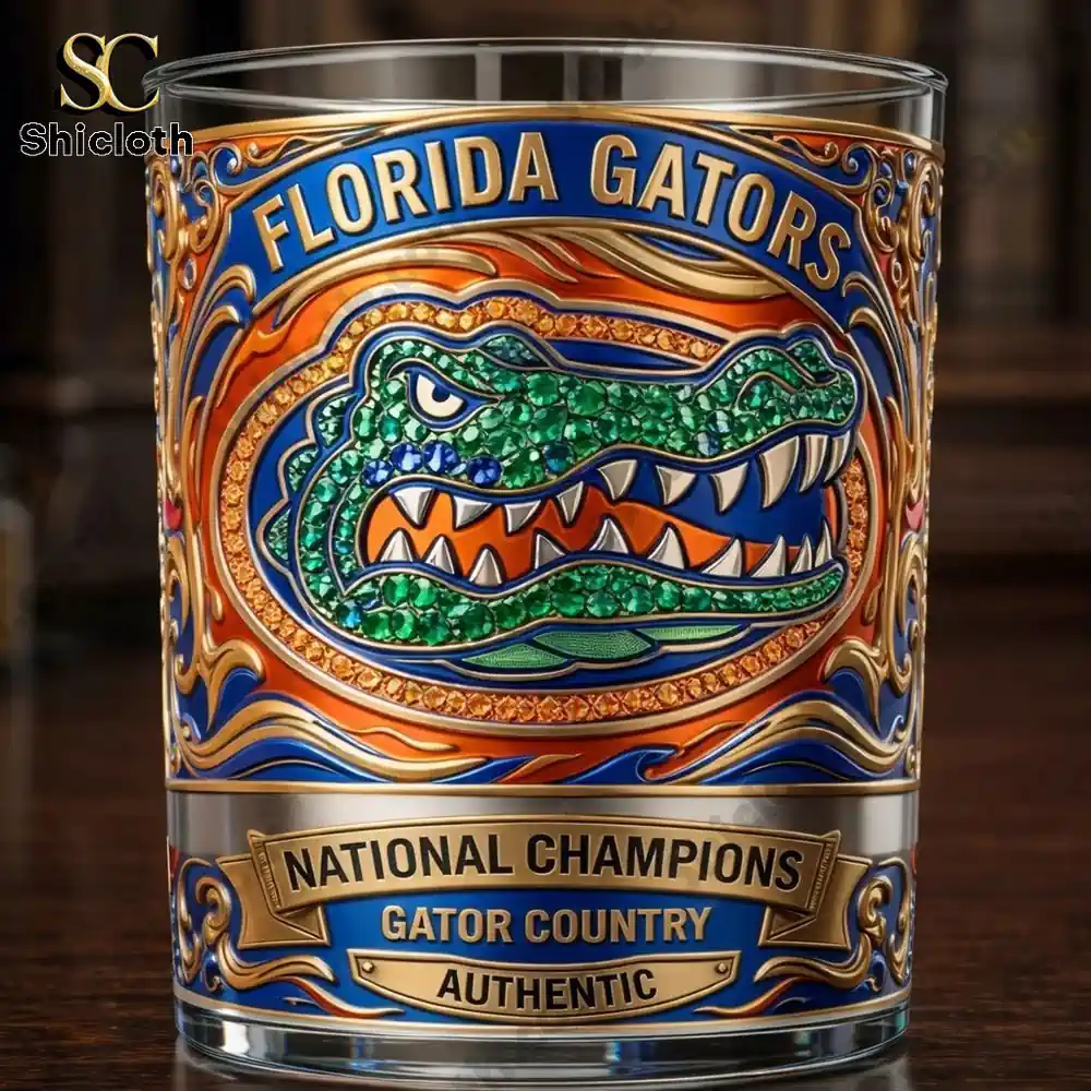 The glass features a vibrant, multi-textured wrap-around design using high-quality dye-sublimation printing. Centered on the front is a fierce, jewel-toned Gator head logo, rendered with a sparkling, textured effect that mimics intricate emerald and sapphire stonework. Above the logo, the words “FLORIDA GATORS” curve in bold gold lettering against a deep blue background. The base of the design is anchored by a golden banner proudly displaying “NATIONAL CHAMPIONS – GATOR COUNTRY – AUTHENTIC.” Every detail is framed by elegant, raised gold and blue filigree patterns that give the glass a luxurious, three-dimensional feel. Crafted from premium glass in 11-15oz sizes, this piece is designed for weight and balance, ensuring every sip of your favorite whiskey feels as celebratory as a game-day victory.