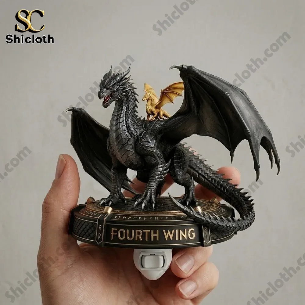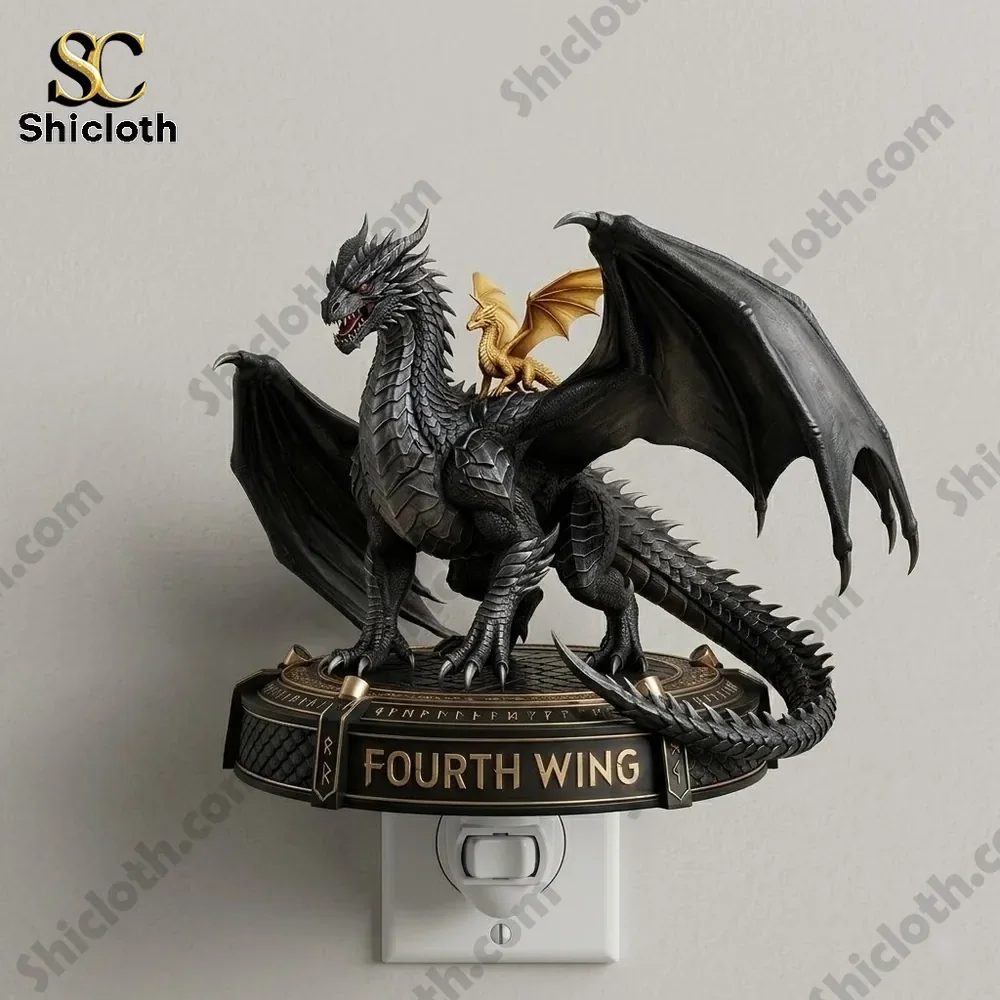 This night light features a meticulously sculpted 3D dragon figure of Tairn standing majestically on a circular base, with the small, vibrant Andarna perched securely on his back. The base is inscribed with the bold text FOURTH WING and surrounded by intricate ancient-style runes that glow softly when the device is plugged in. Crafted from high-quality, heat-resistant resin and durable ABS plastic, the product ensures longevity and safety for overnight use. The color palette is dominated by deep charcoal and obsidian tones for Tairn, contrasted by the brilliant metallic gold of Andarna’s scales. The integrated LED lighting is positioned behind the figures, creating a dramatic silhouette shadow on your wall that brings the dragons to life in the dark.