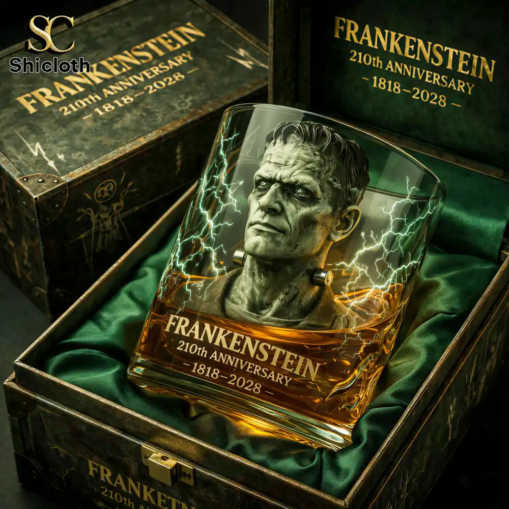This 11-15oz whiskey glass features a 3D-effect portrait of Frankenstein’s monster centered on the front, surrounded by vibrant, glowing light green electrical bolts that mimic the spark of life. The glass is made from premium clear crystal with a heavy, weighted base for a balanced feel in your hand. Below the iconic imagery, the text “FRANKENSTEIN 210th ANNIVERSARY” and the commemorative years “1818-2028” are etched in a sophisticated gold-tone vintage font. For those looking for something truly special, the glass comes in a luxury green satin-lined gift box featuring weathered metallic corners and thematic lightning motifs, making it a perfect choice for birthdays, housewarmings, or as a high-end commemorative award.