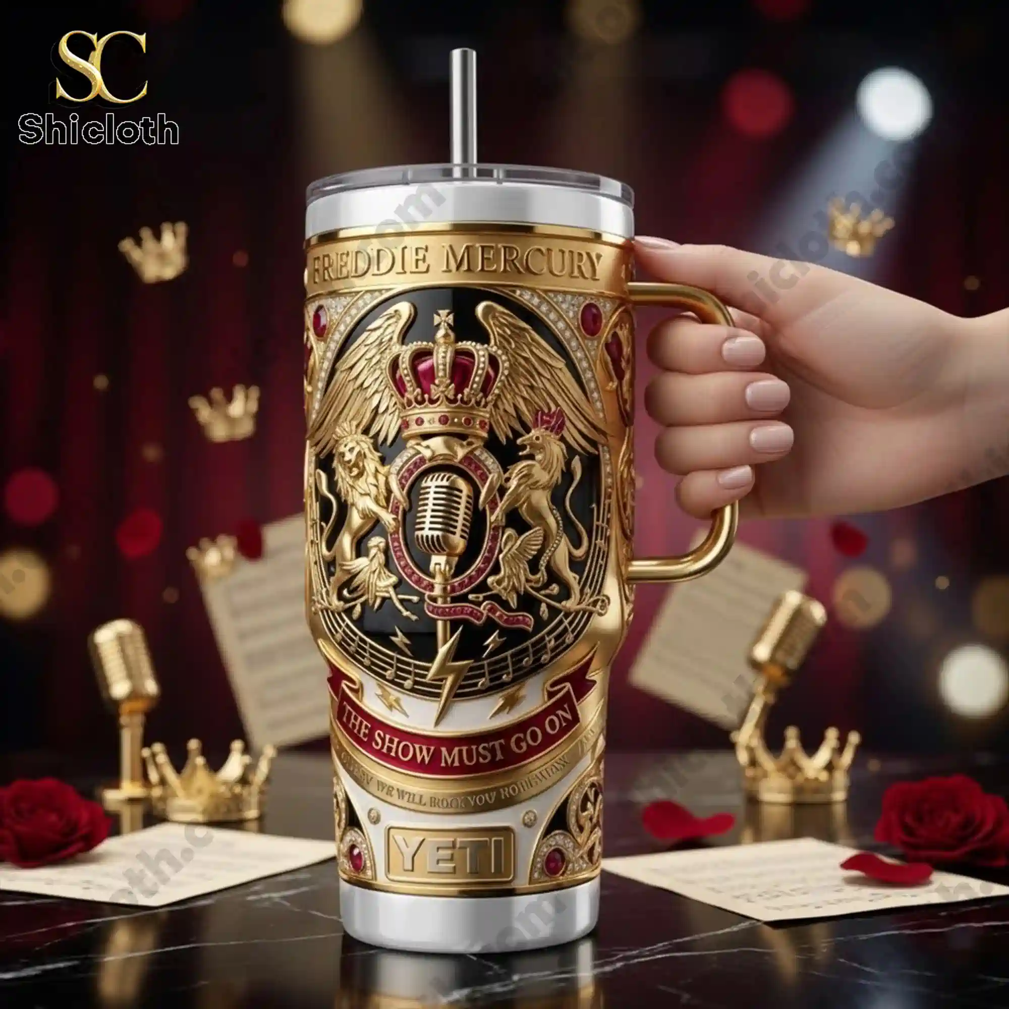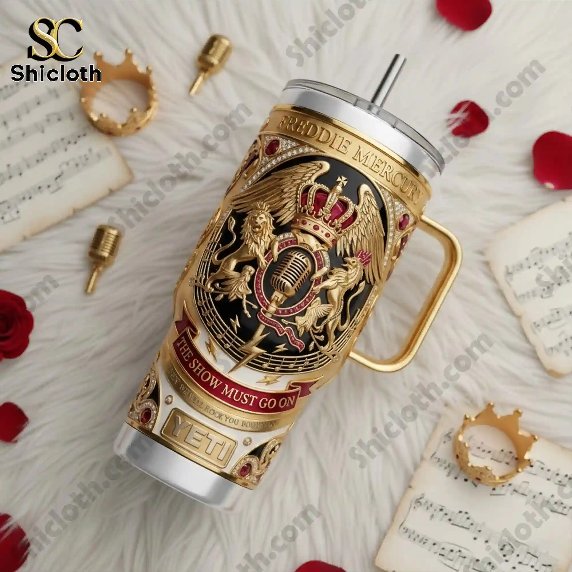 This collector’s item stands out with its intricate gold-toned 3D embossed crest featuring the classic Queen lions and phoenix surrounding a vintage microphone. The body of the tumbler is a sophisticated mix of deep black and royal white, accented by ruby-red faux gemstones and elegant music staff patterns. You will find the words Freddie Mercury etched at the top, while a flowing ribbon displays the powerful lyrics The Show Must Go On. The base is anchored by a sturdy stainless steel construction and a prominent Yeti-style logo plate, all finished with a high-shine polish. The ergonomic golden handle is designed for a firm, comfortable grip, making it easy to carry this heavy-duty piece wherever you go.