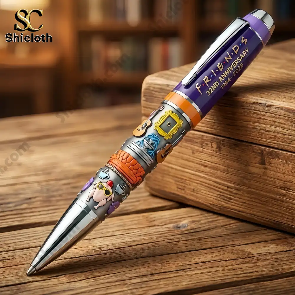 Celebrate a classic with the Friends 32nd Anniversary Collectible Ballpoint Pen set, a beautifully crafted tribute to the iconic sitcom that has captured hearts since 1994. This limited edition pen features a vibrant purple and orange color scheme inspired by Monica’s apartment and the Central Perk sofa. The design is rich with 3D-textured icons, including the famous yellow door frame, Phoebe’s guitar, the Central Perk fountain, and even the hilarious Thanksgiving turkey with sunglasses. Each detail is strategically placed along the barrel to provide a tactile experience while showcasing the show’s most beloved symbols.