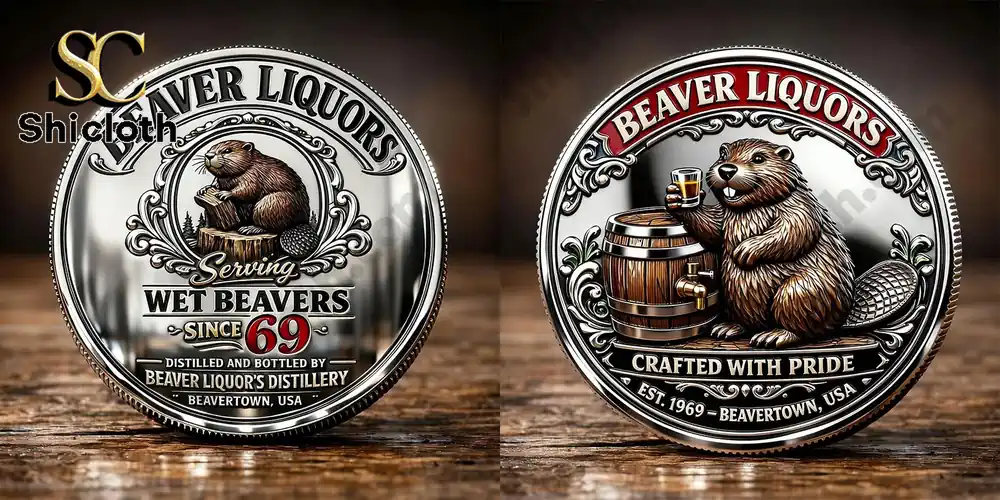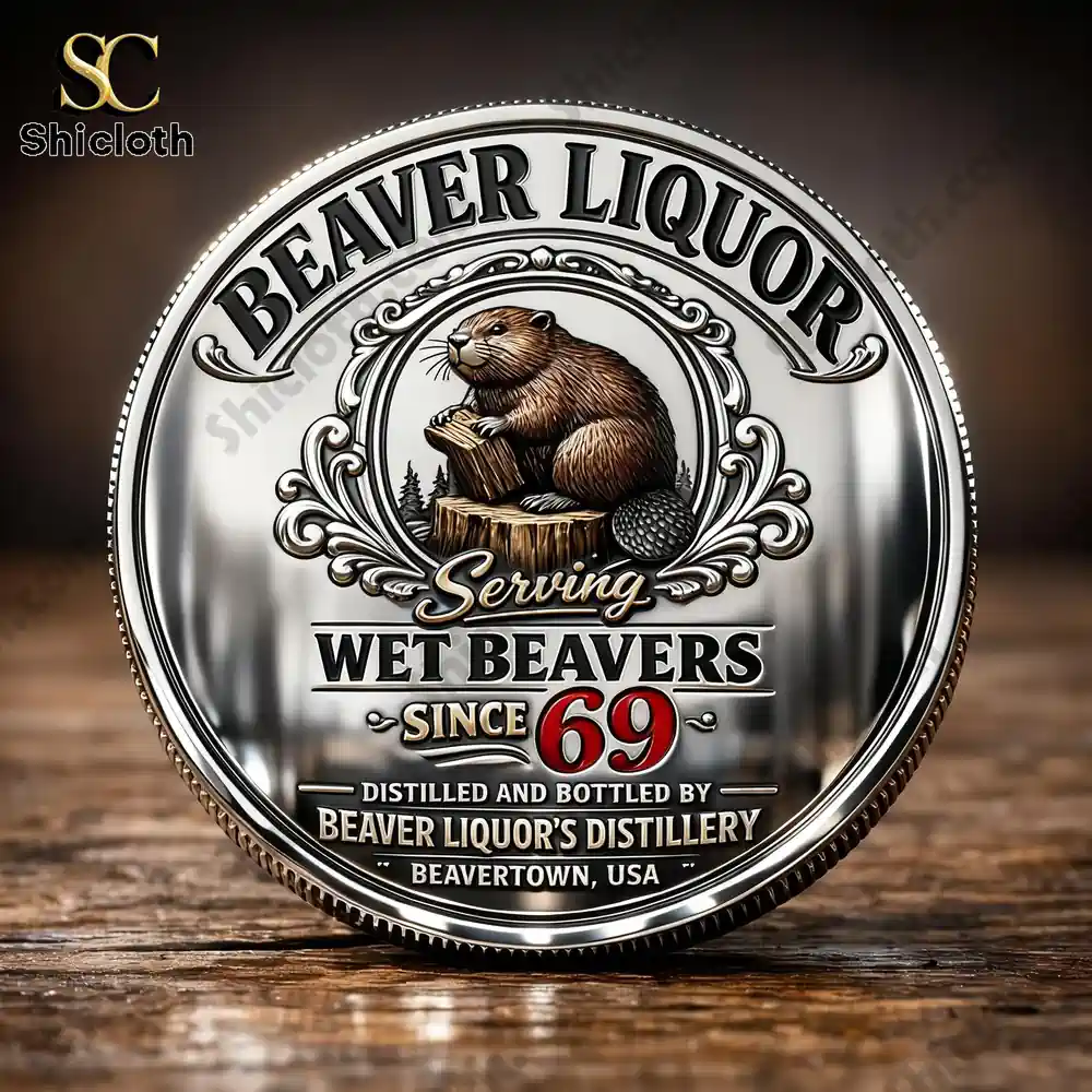 The reverse side of the coin shifts the focus with a different illustration of a beaver perched on a tree stump, surrounded by a delicate forest silhouette and ornate swirling patterns. The text on this side is the highlight for collectors, featuring the humorous slogan SERVING WET BEAVERS SINCE 69 in a mix of black and red bold fonts. Below this, it notes it is DISTILLED AND BOTTLED BY BEAVER LIQUOR’S DISTILLERY. Made from a durable zinc alloy with anti-rust plating, this coin is built to last without tarnishing. It serves as an excellent icebreaker for home bars or a lucky “challenge coin” for social gatherings. To keep the metallic luster sharp, simply wipe it with a soft microfiber cloth and avoid harsh chemicals.