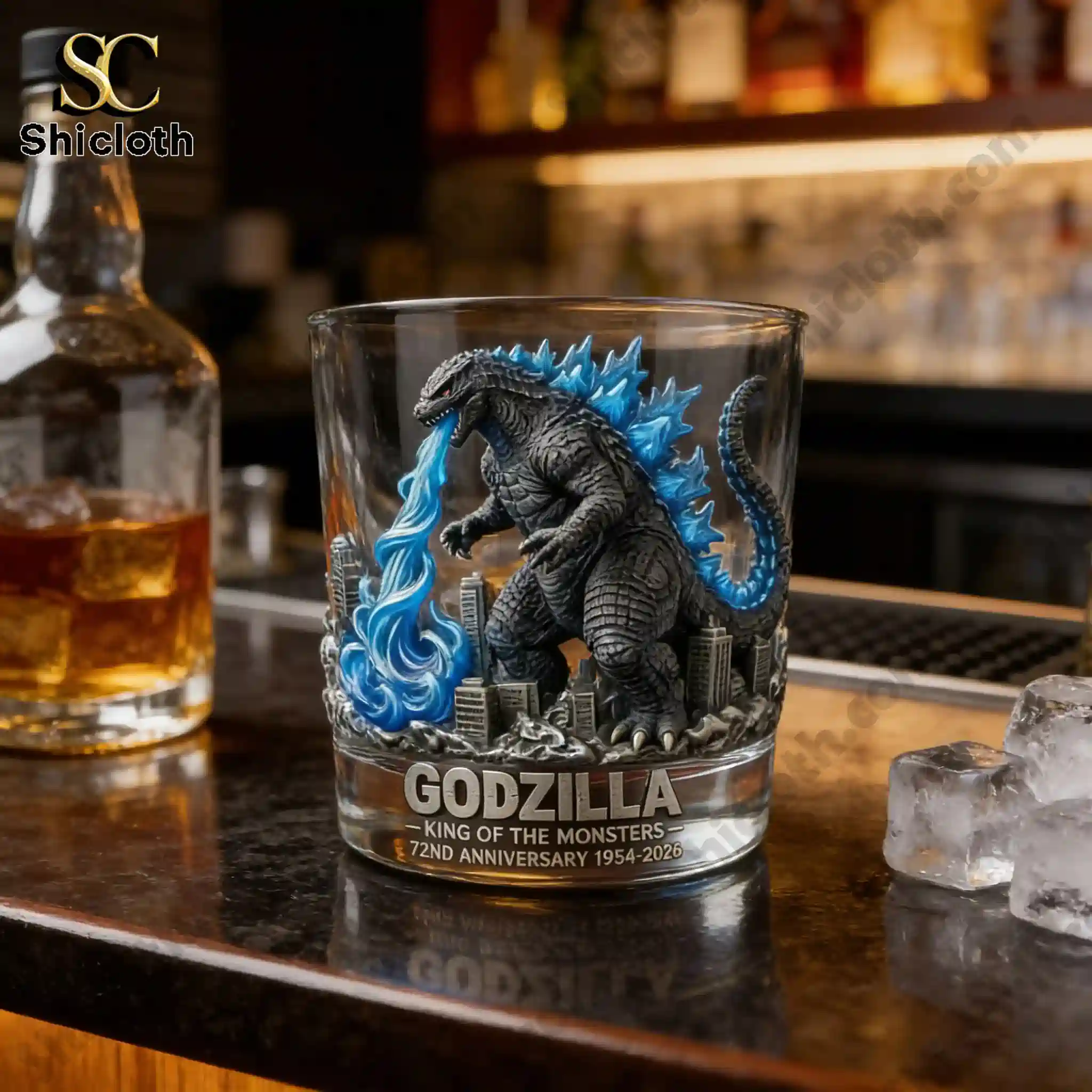 This premium glass features a highly detailed, 3D-sculpted Godzilla figure that appears to be emerging directly from the side of the vessel. The design showcases the monster in a powerful stance amidst a meticulously crafted cityscape of silver-toned skyscrapers at the base. One of the most striking features is the vibrant blue translucent fins and the matching atomic breath effect that wraps around the side, simulating Godzilla’s signature power. The bottom of the glass is elegantly engraved with the text GODZILLA – KING OF THE MONSTERS – 72ND ANNIVERSARY 1954-2026, marking seven decades of cinematic history.