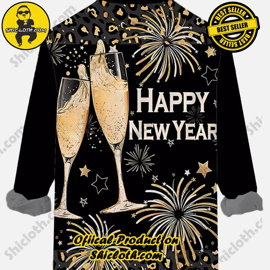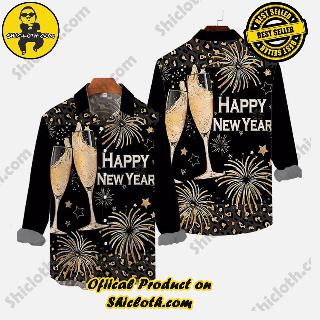 Overview of the Gold Fireworks Stars And Cheers Champagne Glasses Happy New Year Printing Long Sleeve Shirt: