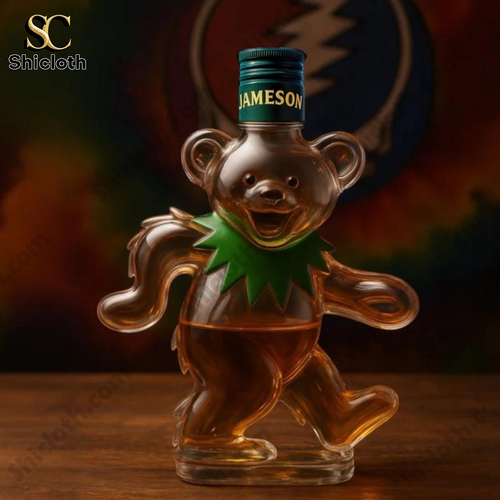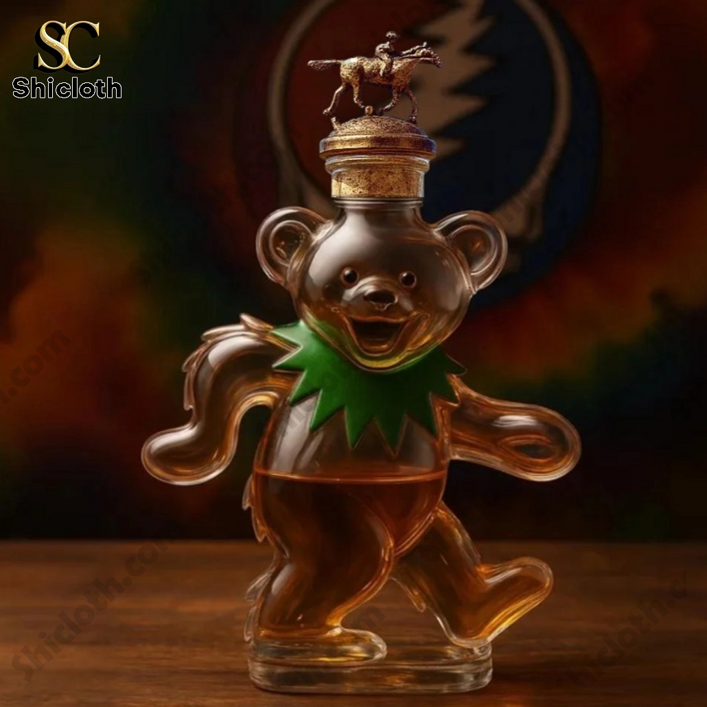 There are several different styles available. In one, the bottle has a classic black and gold cap, while in another, a royal purple crown adds a more whimsical feel. Some versions are topped with a horse-and-rider figurine, which gives it a vintage, collectible vibe, while others feature a simple cork or a Jameson style green screw cap. These subtle differences in design add variety, allowing collectors to choose the one that best suits their tastes. The clear glass allows the whiskey inside to shine, with small, delicate details like the Grateful Dead’s signature collar giving the bear personality. Perfect for collectors, this bottle provides not only an attractive display piece but also an excellent functional use for whiskey storage.