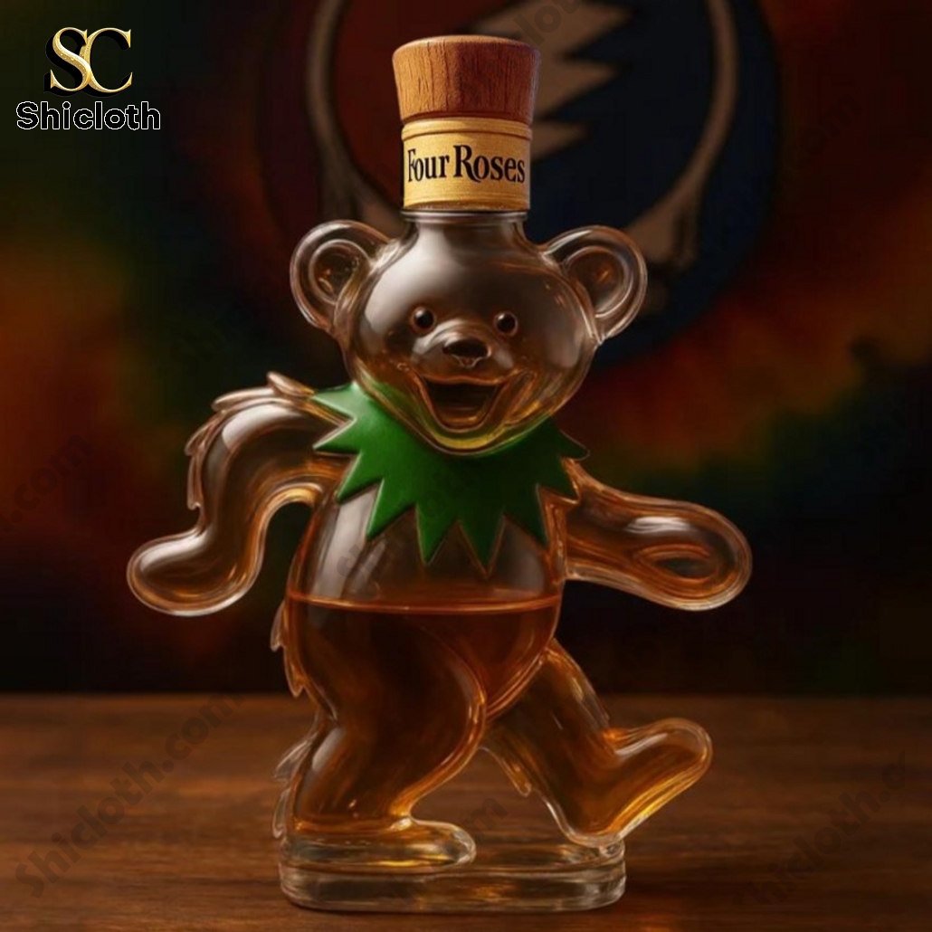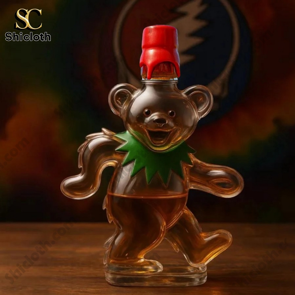 The Grateful Dead Bear Crown Royal Whiskey Bottle comes in a unique design that blends the iconic bear figure with a whiskey bottle. This bottle is made of clear, glass material that shows off the amber liquid inside. The bear design has a friendly, playful posture, with a green collar around its neck, resembling the traditional Grateful Dead aesthetic. The bottle’s cap varies in some versions, such as a standard crown design, a regal crown, a horse-and-rider figurine, or a more standard cork top, each adding a unique touch to the bottle.