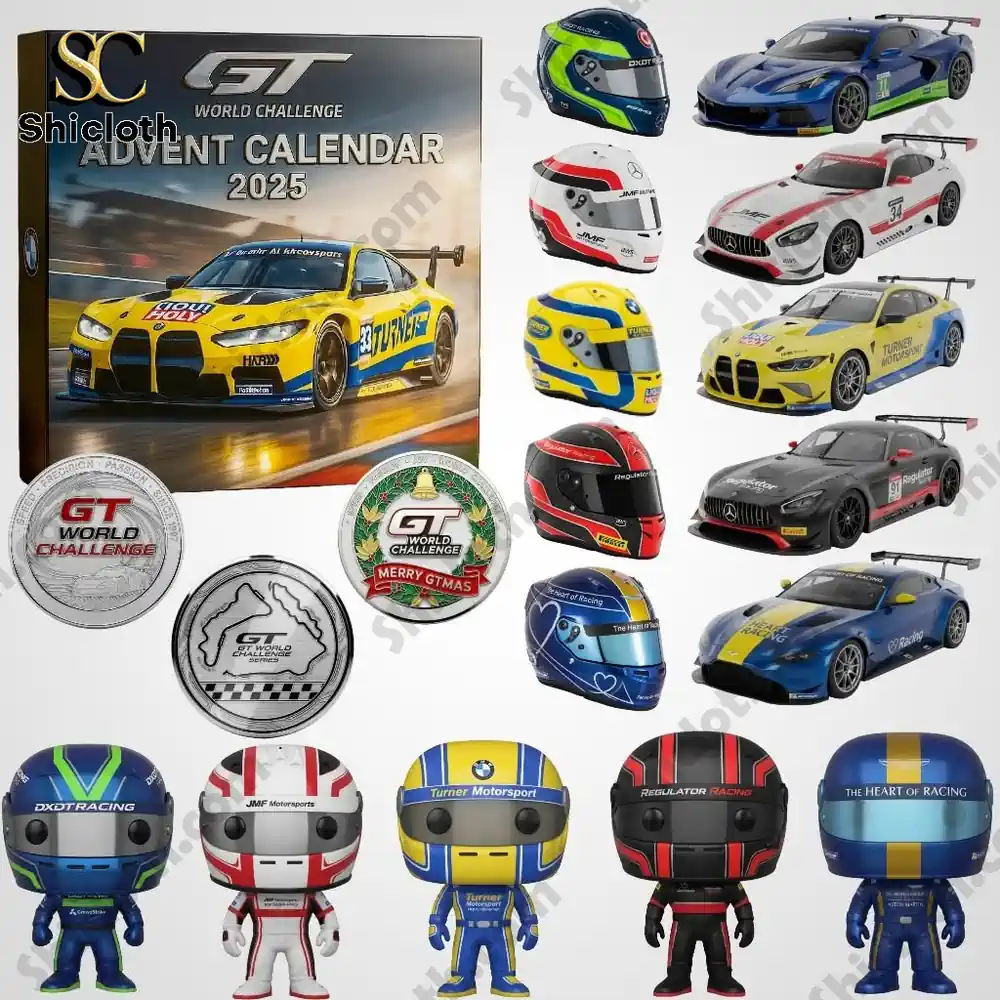 This calendar is an absolute must-have because of the incredible variety inside. You won’t just get one thing; you’ll get an amazing mix of 24 high-quality surprises. Open the doors to find a pit crew’s worth of gear, including detailed miniature racing helmets, pop-style figures of your favorite drivers in full race suits (like DXDT Racing and The Heart of Racing), and even miniature replica GT cars. It also includes special commemorative GT World Challenge coins to mark the 2025 season.