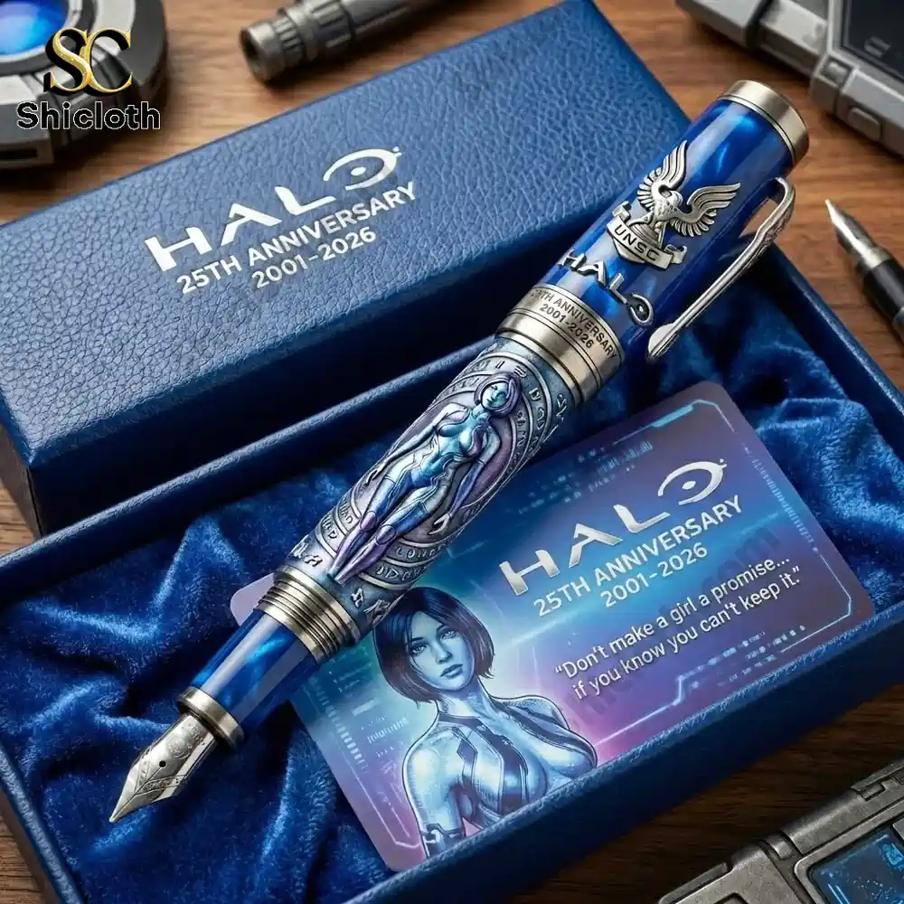 To celebrate the quarter-century legacy of one of gaming’s most iconic franchises, the HALO 25th Anniversary Fountain Pen collection offers fans a tangible piece of history. These pens come in two distinct styles: a “Master Chief” edition featuring a deep sage green finish with bronze accents, and a “Cortana” edition in a vibrant translucent cobalt blue with silver-tone hardware. Both versions are housed in premium leatherette presentation boxes, complete with a commemorative card featuring legendary quotes from the series.