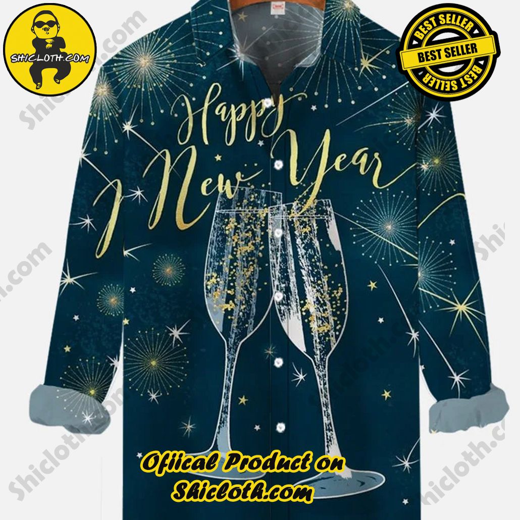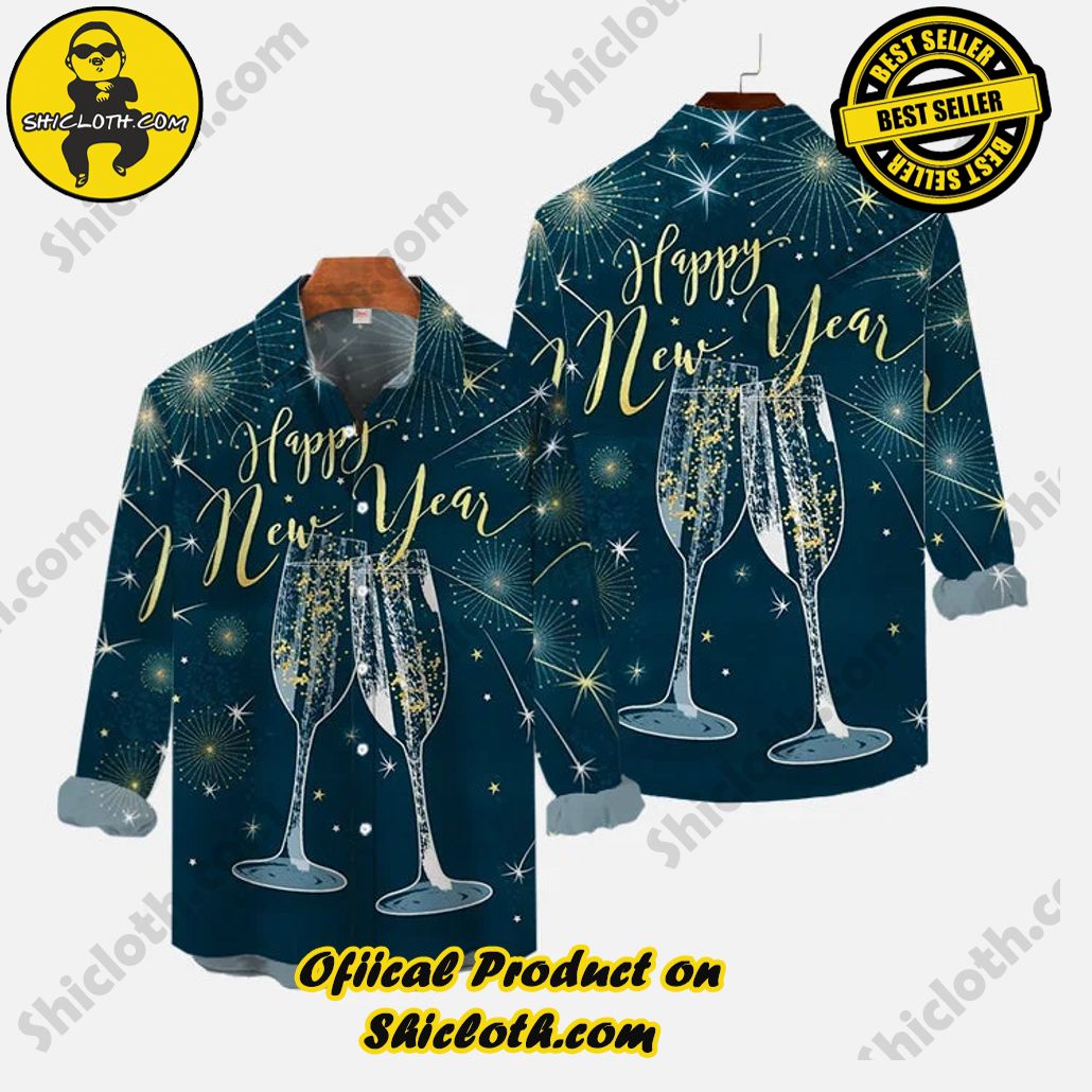 Overview of the Happy New Year Champagne Glasses Cheers And Fireworks Printing Long Sleeve Shirt: