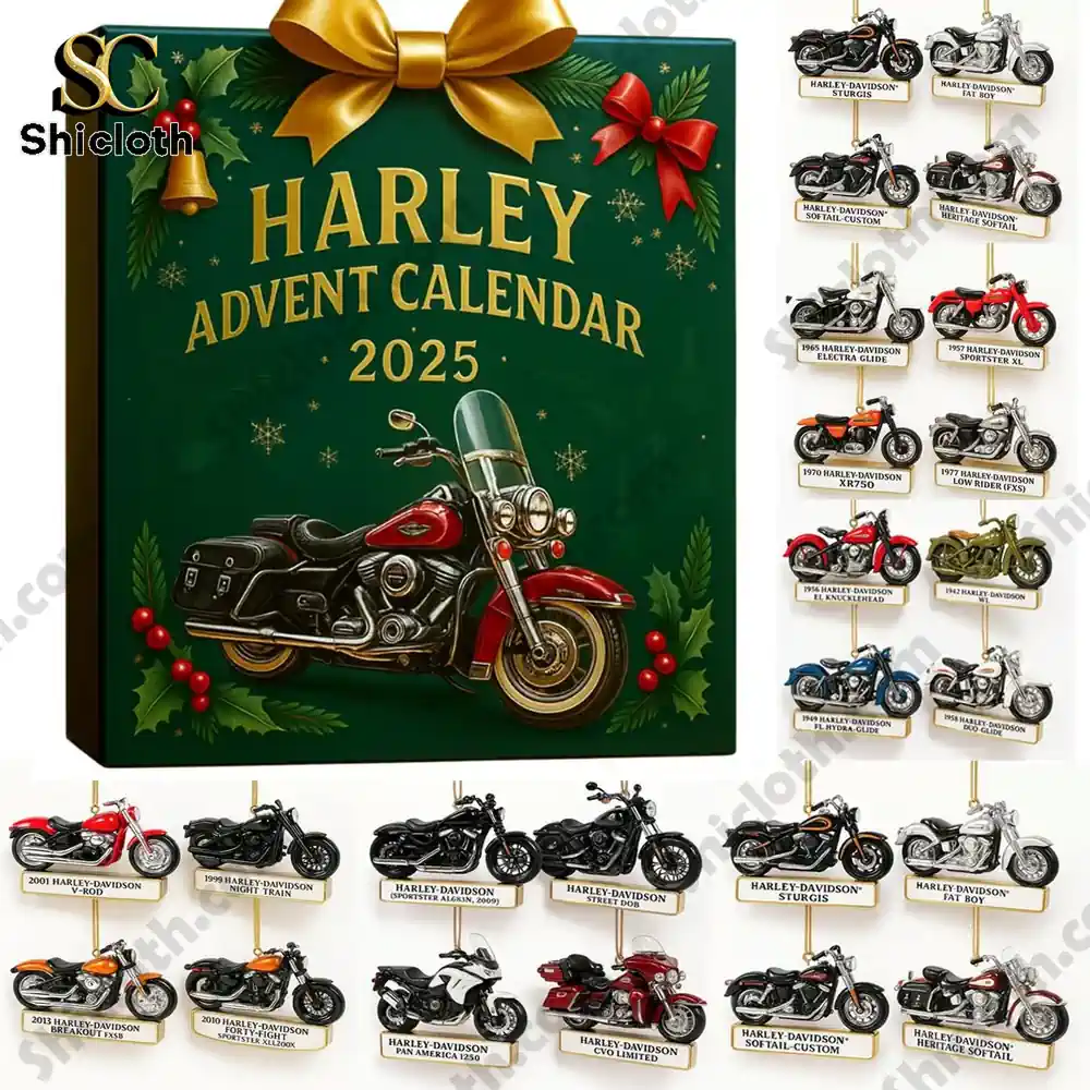 The calendar itself is presented in a rich green box, resembling a beautifully wrapped present, tied with a large golden bow at the top. The bold, gold lettering proudly displays “HARLEY ADVENT CALENDAR 2025“. Dominating the center is a detailed image of a classic red and black Harley-Davidson touring motorcycle, complete with a windscreen and saddlebags. The festive atmosphere is enhanced by small holly berries, green leaves, gold bells, and red bows adorning the edges, all printed with high-quality dye-sublimation for vibrant and lasting color. This meticulous printing technique ensures every detail, from the motorcycle’s chrome to the subtle snowflakes, is captured perfectly. The ornaments, which represent various legendary Harley models spanning different years (like the 1998 Harley-Davidson Night Train and the 2020 Harley-Davidson Sporty-48 as seen in the collection), are made from a durable, lightweight material ideal for hanging on a Christmas tree. The calendar is designed to be displayed prominently, offering a daily treat that builds anticipation for the holiday.