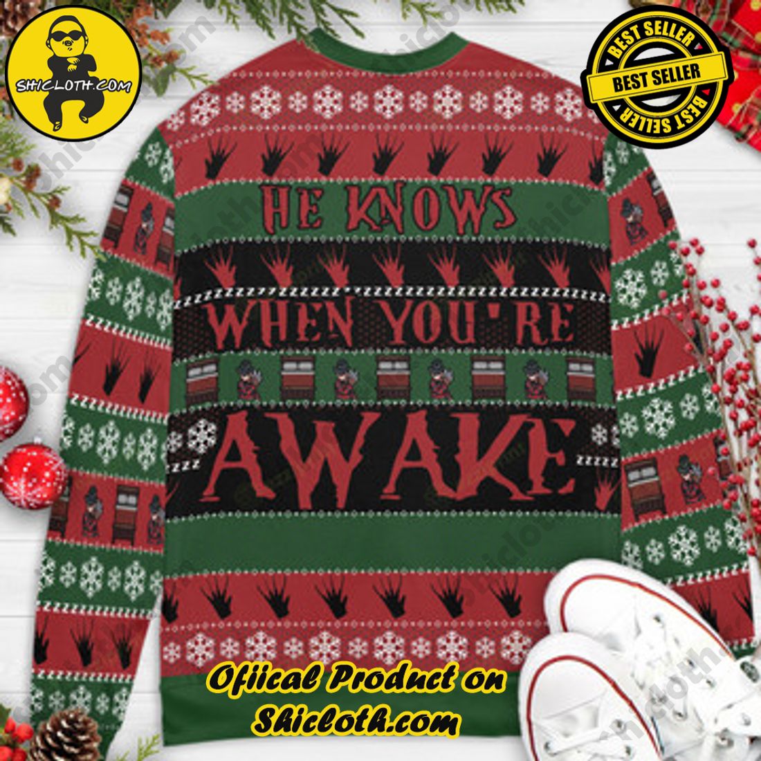 Introducing the He knows when you’re sleeping Freddy Krueger A Nightmare on Elm Street Ugly Christmas Sweater, the ultimate apparel to make a bold and chilling fashion statement this holiday season. Crafted with the highest quality materials, this sweater combines festive cheer with a touch of horror, perfectly capturing the essence of A Nightmare on Elm Street. With its unique design featuring the iconic Freddy Krueger, this sweater is an absolute must-have for horror movie enthusiasts and fans alike. But that’s not all – this product is not only top-notch in quality but also incredibly affordable. We offer competitive pricing that ensures you get the best bang for your buck. And the more you buy, the bigger your discount, making it an excellent choice for gifting to friends and family who share your passion for horror movies. Additionally, we offer an easy return policy, allowing you to shop with confidence and peace of mind. So why wait? Embrace your love for horror this Christmas and grab the He knows when you’re sleeping Freddy Krueger A Nightmare on Elm Street Ugly Christmas Sweater today!