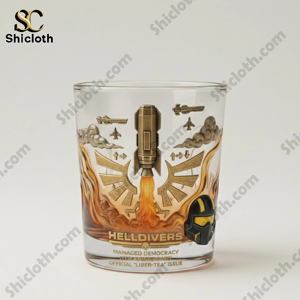 This 11-15oz glass is a visual masterpiece featuring a 3D-textured Stratagem rocket launching from the center, complete with a vibrant orange flame trail. The design is packed with detail, including the iconic Helldiver helmet in black and yellow, soaring Eagle fighter jets, and the golden laurel wings of the Super Earth crest. Small tactical arrows (up, right, down) are etched around the rocket, mimicking the in-game code inputs we all know and love. The base is anchored by the bold “HELLDIVERS” logo and “Official Liber-Tea Issue” text. Made from high-quality, weighted glass with dye-sublimation printing, it feels solid in your hand—perfect for a cold drink after a long mission against the Automatons.