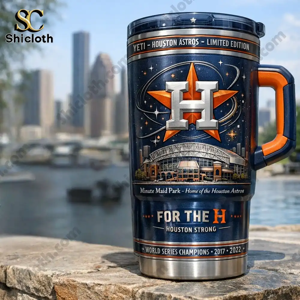 This Houston Astros For The H Yeti Tumbler is a premium, limited-edition drinkware set designed for die-hard fans who want to celebrate their team’s championship legacy. Featuring a stunning deep navy blue finish with high-contrast orange and silver accents, this tumbler showcases a detailed 3D-style Houston Astros logo centered above an intricate illustration of Minute Maid Park. The design is rich with small details, including a celestial star-map background, “Houston Strong” branding, and a dedicated banner honoring the 2017 and 2022 World Series Champions. The matching collector’s box mirrors this artistry, making it an excellent display piece or a high-end gift for any Houston supporter.