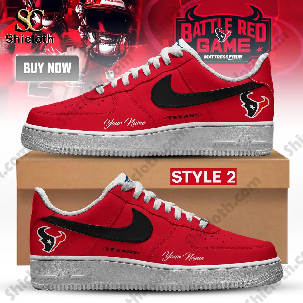Style 1 rocks a bold, two-tone look with a striking black toe box and saddle contrasted by the vibrant Battle Red leather on the rest of the upper. The iconic black Nike Swoosh is outlined in a thin white stripe, providing a clean separation. You’ll find the Houston Texans bull logo prominently featured near the heel, adding that unmistakable team spirit. Key text includes “TEXANS” in white on the outer midfoot, and an option for “Your Name” or “H TOWN” near the laces in a neat, cursive script. The outsole is a clean white, giving it that fresh, classic finish. This style is perfect for fans who love a sharp, contrasting design that stands out.
