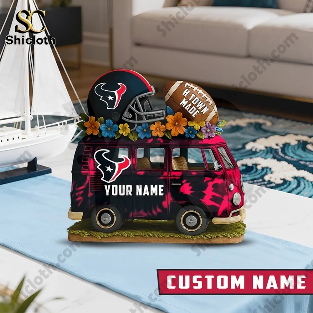 This product is a visual treat, showcasing a high-resolution UV printing process that brings out the deep navy and bright red of the Texans’ team colors. The van is intricately detailed with a floral arrangement on the roof, adding a unique “peace and love” aesthetic to the competitive spirit of football. A key feature is the customizable name section on the side of the bus, allowing you to add your own name or a friend’s name to make it a one-of-a-kind collectible. The plaque sits on a stable base designed to look like a patch of grass, making the entire scene pop against any background.