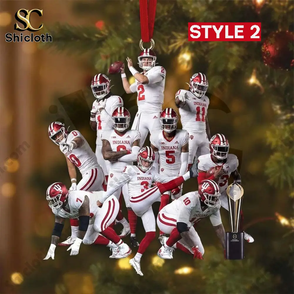 Our ornaments are designed to look incredible on any Christmas tree or as a standalone decoration. Let’s look at the details. Style 1 prominently features Head Coach in a red shirt at the center, surrounded by nine players in white jerseys and crimson helmets, set against a snowy background. The text “BIG CHAMPIONS 20 25” is clearly displayed in a bold red box at the bottom, marked with the Indiana University trident logo. The design feels like a powerful team huddle. Style 2 is all about action, showcasing nine different players in their white uniforms and red accents in dynamic poses, with the National Championship Trophy subtly placed near the base. The image is set against a warm, blurred background, giving it an elevated, professional sports photography feel. Both styles utilize single-sided, high-resolution printing to ensure the colors—the vibrant white and deep crimson—pop with clarity.
