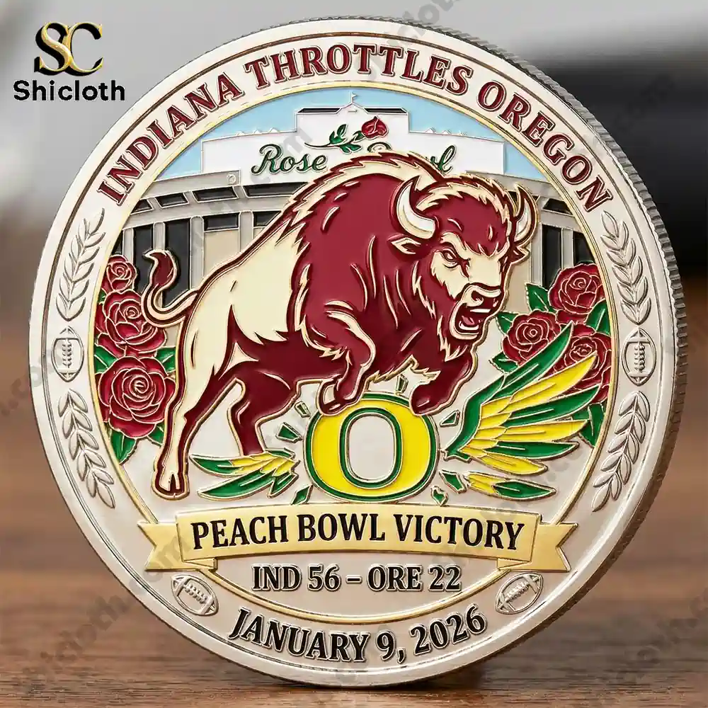 This coin is a masterpiece of detail, featuring a high-quality metal build that gives it a heavy, polished feel in your hand. On the front, you’ll find a powerful bull mascot charging over a vibrant yellow “O” logo, surrounded by delicate red roses and green leaves to signify the Rose Bowl and Peach Bowl connection. The reverse side proudly displays the Indiana “IU” emblem encircled by a gold ribbon that reads CFP National Championship Bound. Every tiny element, from the wheat stalks bordering the edges to the specific date of January 9, 2026, is etched with crisp clarity to ensure it remains a standout piece in your collection.