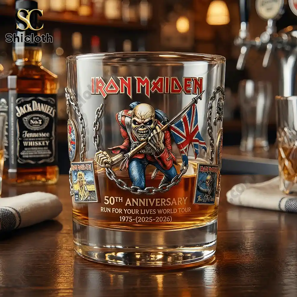 Celebrate five decades of heavy metal history with the Iron Maiden 50th Anniversary Whiskey Glass, a premium collectible designed for fans who appreciate legendary music and a fine drink. This stunning glass commemorates the Run For Your Lives World Tour (1975-2026), featuring the iconic Trooper Eddie front and center, clutching a tattered Union Jack. The artwork is incredibly detailed, showcasing Eddie surrounded by a textured silver chain border and flanked by smaller, classic album art thumbnails like Fear of the Dark. Every element is applied using high-quality dye-sublimation printing, ensuring the vibrant reds and golds of the 50th Anniversary logo stay sharp and clear.