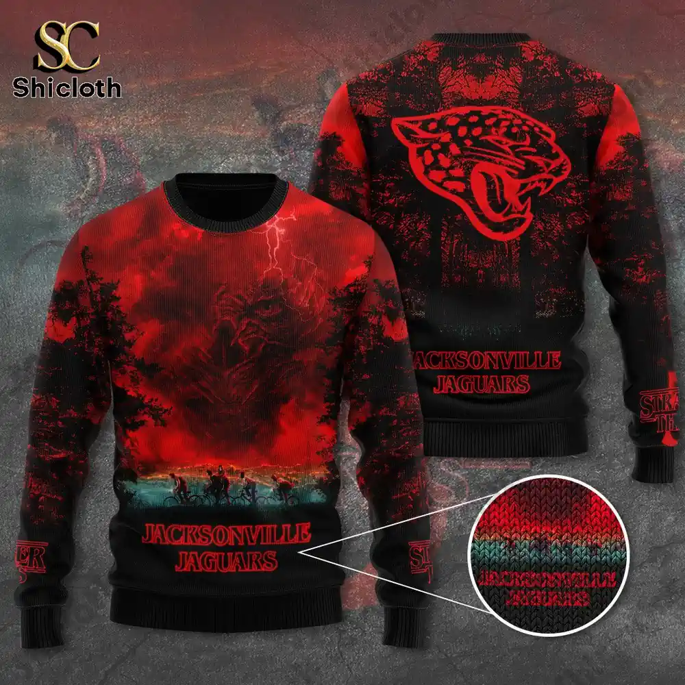 This striking piece is primarily black and vibrant red, capturing the dark, stormy atmosphere of the Upside Down beautifully contrasted with the team’s fierce colors. The front features a dramatic, large-scale image where the Mind Flayer’s terrifying silhouette looms over a dense, dark forest, all under a blood-red, lightning-streaked sky. Below, the four kids on their bikes cycle across a mysterious, dimly lit landscape, with the phrase “JACKSONVILLE JAGUARS” prominently displayed. The back is just as bold, dominated by the roaring Jacksonville Jaguars logo in bright red, overlaid on a forest and sky background, with the team name subtly placed beneath. Small, intricate details, like the “STRANGER THINGS” text near the cuffs and the subtle, detailed knit pattern (a close-up shows a beautiful mix of red, black, teal, and gold stripes), make this sweater truly unique.