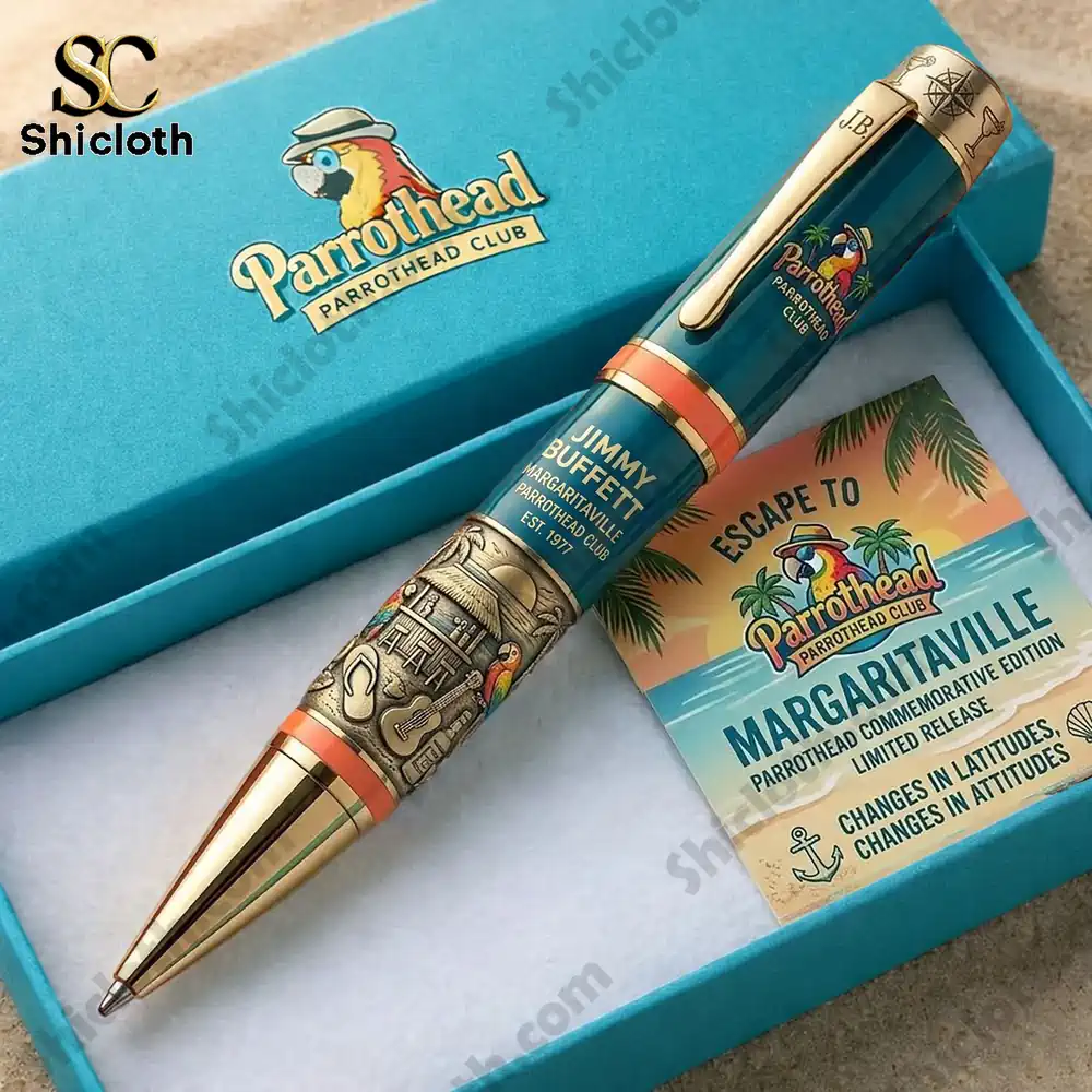 The Jimmy Buffett Margaritaville Parrothead Commemorative Pen is a premium writing instrument designed for fans who want to carry a piece of the tropical lifestyle with them. This limited-release pen combines a vibrant teal and gold aesthetic with intricate embossed details that celebrate the legendary “Parrothead” culture. It serves as both a functional tool and a collector’s keepsake, capturing the “Changes in Latitudes, Changes in Attitudes” spirit in every stroke.