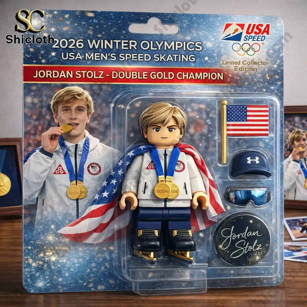The Jordan Stolz Double Gold Champion 500m & 1000m Olympic Legacy Pop Figure Doll is a premium commemorative collectible celebrating the historic achievement of the American speed skating sensation. This figure meticulously replicates the athlete’s iconic podium appearance, featuring a detailed miniature wearing a white USA-branded athletic jacket, navy blue racing trousers, and golden-bladed speed skates. As experts in specialized sports memorabilia, we have ensured every detail is accurate, from the dual gold medals marked 500m and 1000m draped over the neck to the American flag worn as a triumphant cape.