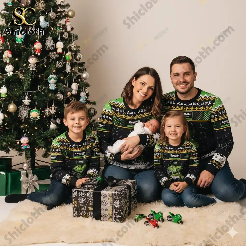 - The Ultimate Sweater for Team Green: Win every ugly sweater contest and be the talk of the party with a design that screams Kawasaki pride. The sweater brilliantly integrates classic holiday patterns like reindeer and snowflakes with motorsport elements like checkered flags and motorcycle silhouettes.