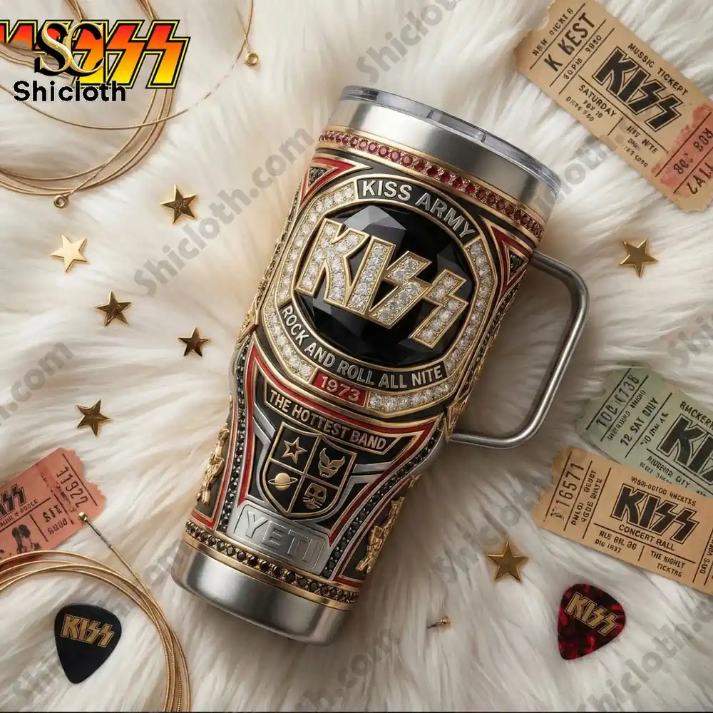 This eye-catching tumbler is crafted from high-quality inox stainless steel, featuring a robust double-wall insulated design. The exterior is a visual masterpiece, showcasing a large, diamond-encrusted KISS logo set against a faceted black gemstone backdrop. You will find the iconic “Rock And Roll All Nite” and “1973” text framed by elegant gold and red accents. The lower section includes a distinctive shield emblem representing the band members’ personas, all sitting above a rugged, metallic YETI-style base. To make it even more practical, it comes with a sturdy side handle and a reusable metal straw, ensuring a comfortable grip whether you are at a concert or in your backyard.