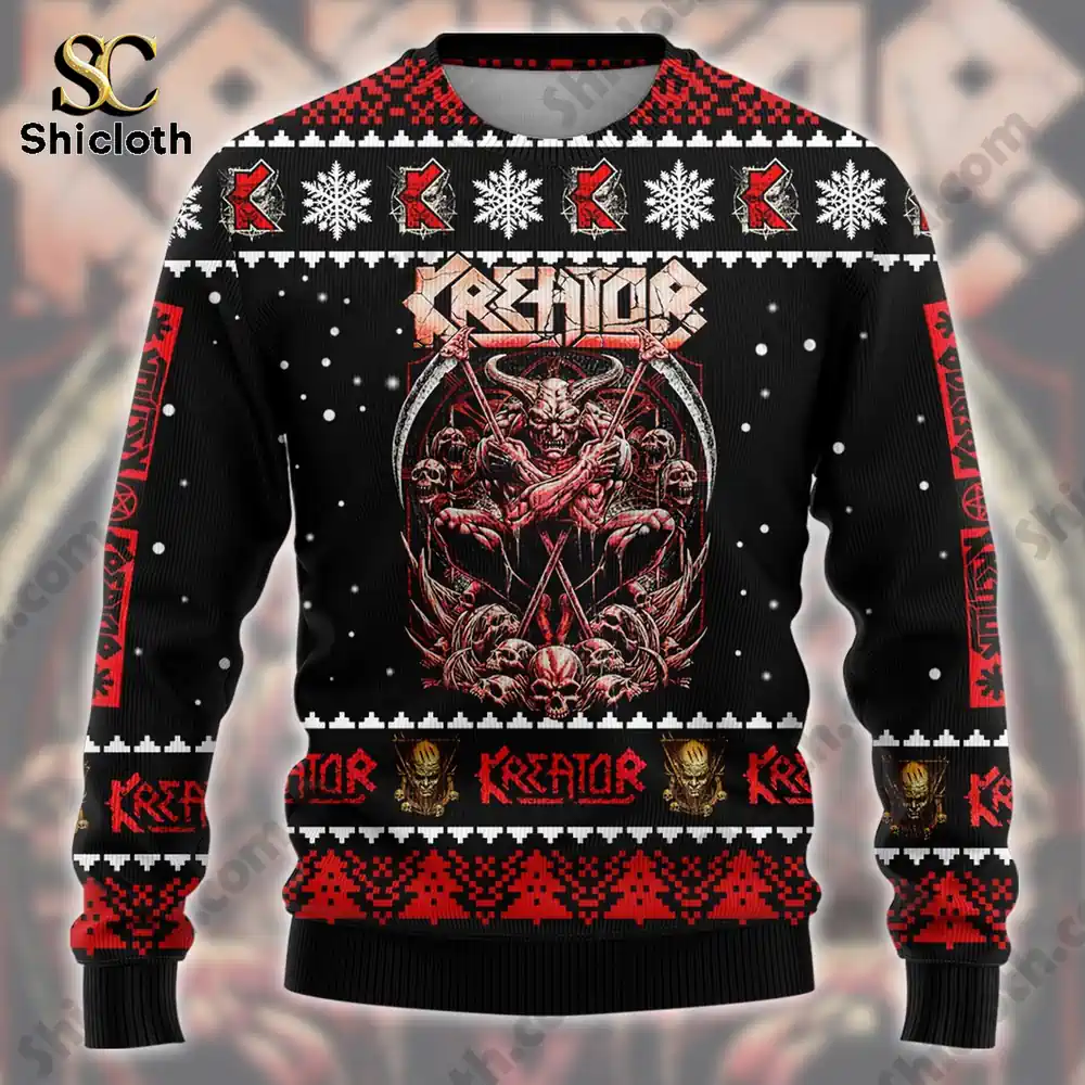 Ready to ditch the silent night for a violent revolution this Christmas? The Kreator Rock Ugly Christmas Sweater is here to ensure your holiday party is anything but boring! This fierce garment is the ultimate tribute to the legendary German thrash metal band, Kreator, one of the “Big Four” of Teutonic thrash metal alongside Destruction, Sodom, and Tankard. Known for their relentless speed and brutal sound since 1982, this sweater perfectly smashes the band’s iconic extreme aggression into classic, cozy holiday style. It’s perfect for any metalhead who wants to bring some headbanging energy to their festive celebrations.