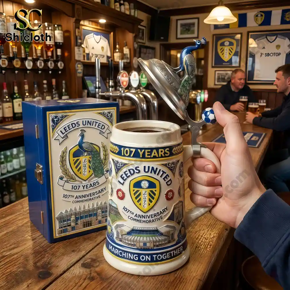 This commemorative stein is a visual masterpiece, featuring a premium-quality ceramic body with a scratch-resistant finish for long-lasting durability. The front is dominated by the official Leeds United crest, flanked by the “107 Years” milestone and the “Marching On Together” motto at the base. One of the most unique features is the ornate metal lid, which is topped with a detailed peacock figurine—a nod to the club’s “Old Peacock” nickname—and a football-shaped thumb lever. The exterior is further adorned with high-definition illustrations of Elland Road and the Yorkshire Rose, ensuring every angle tells a story of heritage.