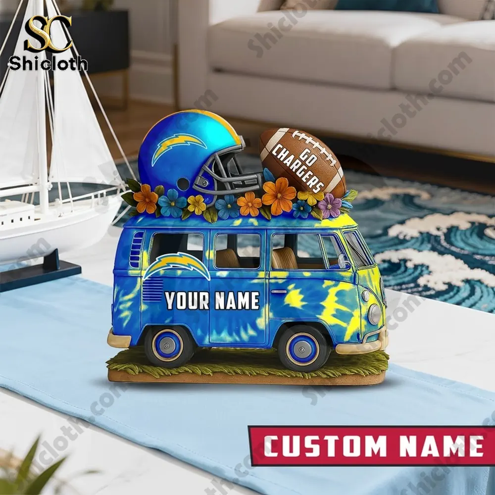 This unique Los Angeles Chargers acrylic plaque is a standout piece of fan gear that combines a retro vibe with modern customization. Featuring a classic tie-dye van decked out in the team’s iconic powder blue and yellow, the plaque is topped with a detailed Chargers helmet, a “Go Chargers” football, and vibrant decorative flowers. It serves as a high-quality tribute for any supporter, blending team spirit with a stylish, artistic touch that fits perfectly on a desk, bookshelf, or mantle.