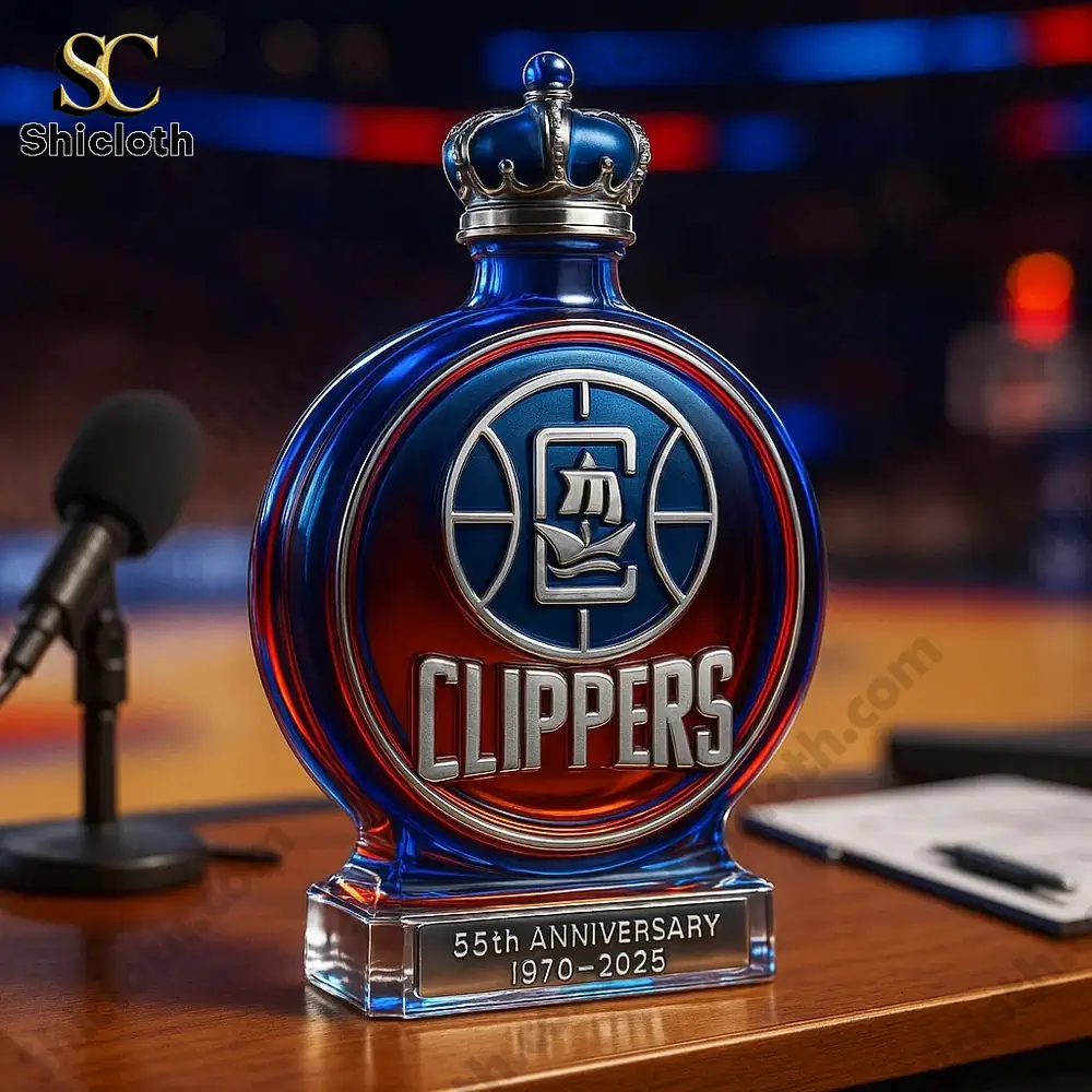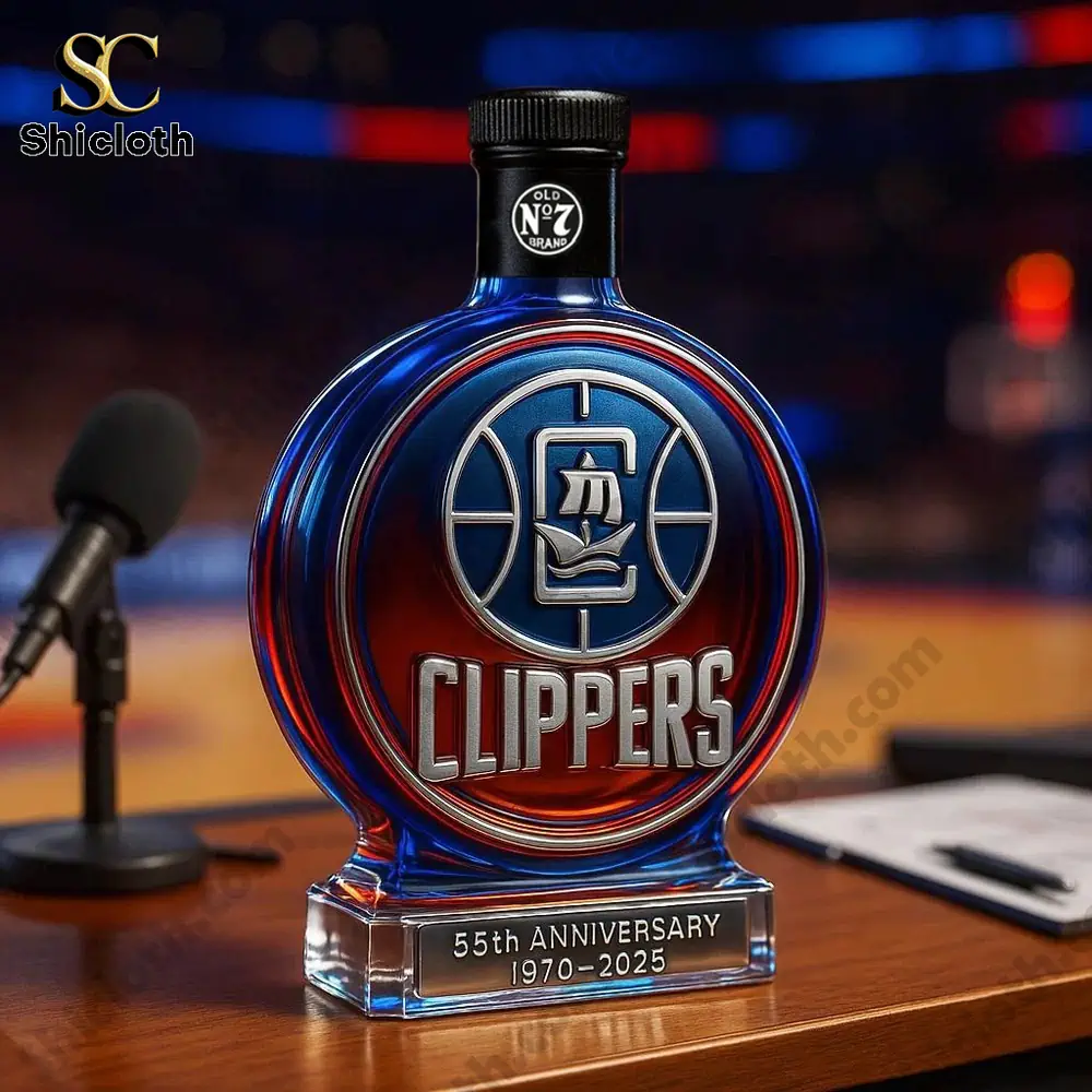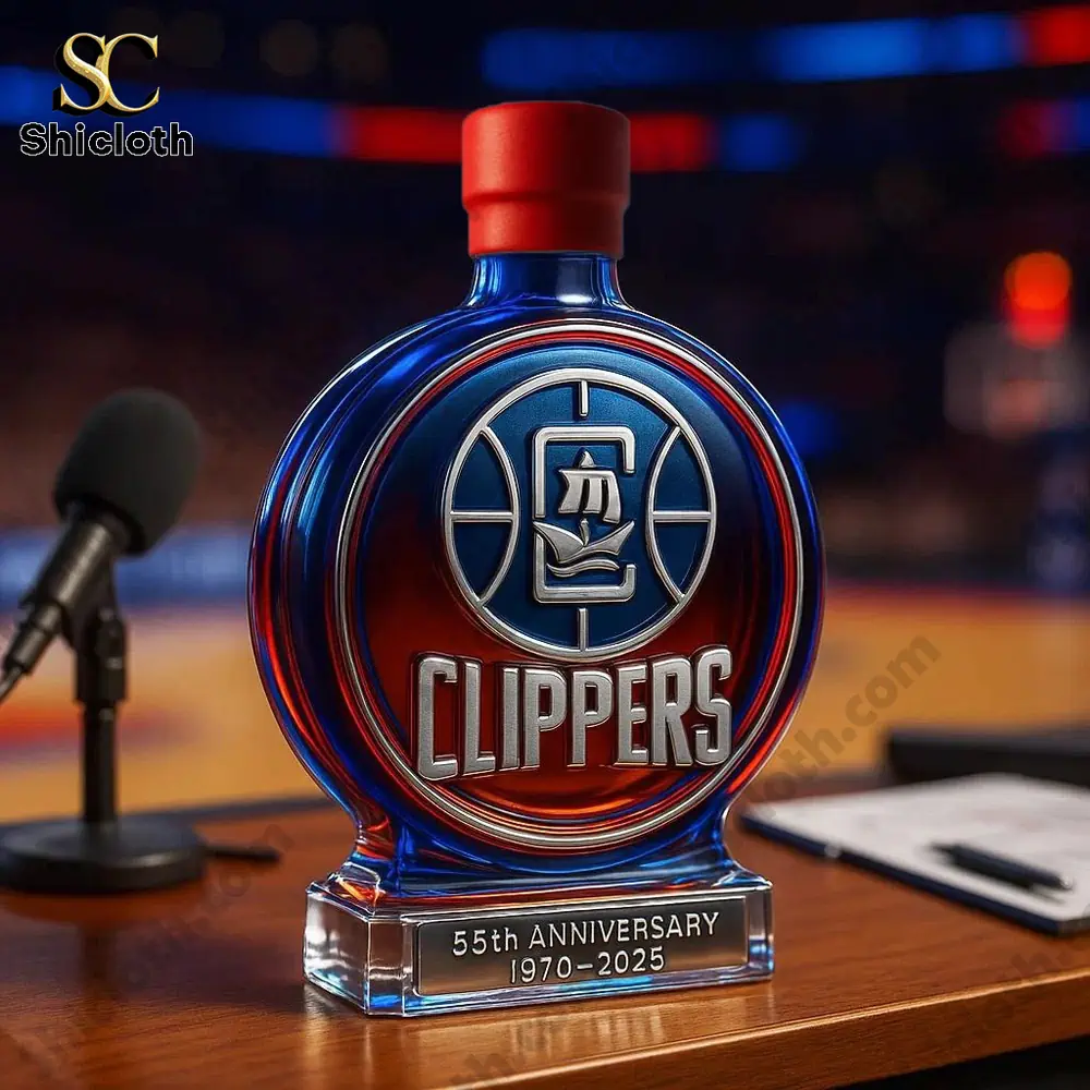 The bottle features a smooth, rounded flask shape with a heavy, clear glass base, designed to sit proudly on any surface. The glass is richly colored in the Clippers’ current team colors: deep navy blue and vibrant ember red, highlighting the modern, bold logo. The front showcases the large, circular primary logo in relief: the navy blue ring is surrounded by a metallic red border, and at the center is the silver basketball outline enclosing the stylized ‘C’ with the ship emblem—a nod to the team’s “Clipper” heritage dating back to San Diego. Below the emblem, the word “CLIPPERS” is boldly molded into the glass in metallic silver, ensuring the text literally shines. The clear base acts as a display stand, featuring a metallic plaque engraved with the commemorative text: “55th ANNIVERSARY 1970–2025”. To top it off, you can choose from various caps: the iconic Blue and Silver Crown (Crown Royal style), a sleek Black Screw Cap (Jack Daniel’s style), or the vibrant Red Wax Drip Cap (Maker’s Mark style).