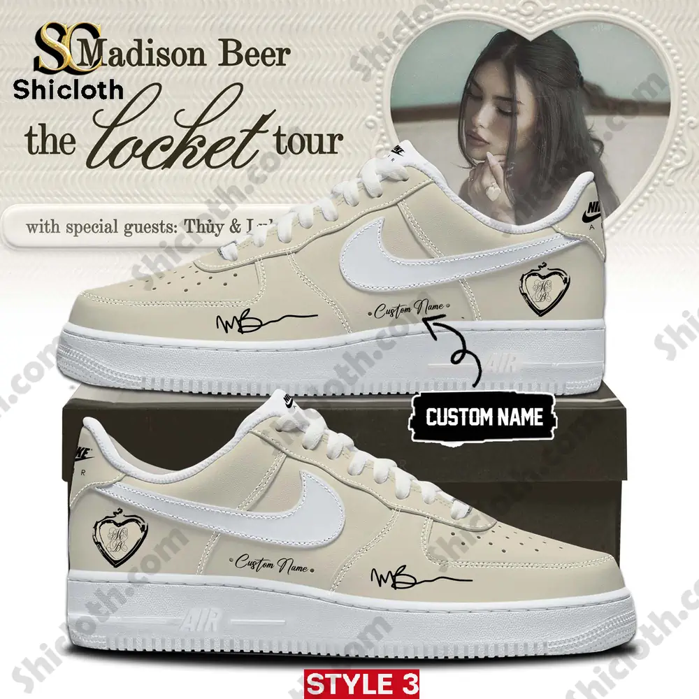 The Madison Beer The Locket Tour custom sneakers offer a perfect blend of fan-focused design and modern aesthetics, available in three unique styles to match your personal taste. Style 1 features a prominent black swoosh set against a cream base, while Style 2 utilizes a classic white and beige color-block pattern, and Style 3 presents a clean, monochromatic cream upper with a white swoosh. Every pair is constructed using durable synthetic tumbled leather and showcases specific tour-inspired details, including a delicate locket heart motif on the heel, the iconic MB signature on the front side, and a specialized area for a custom name to make the shoes uniquely yours.