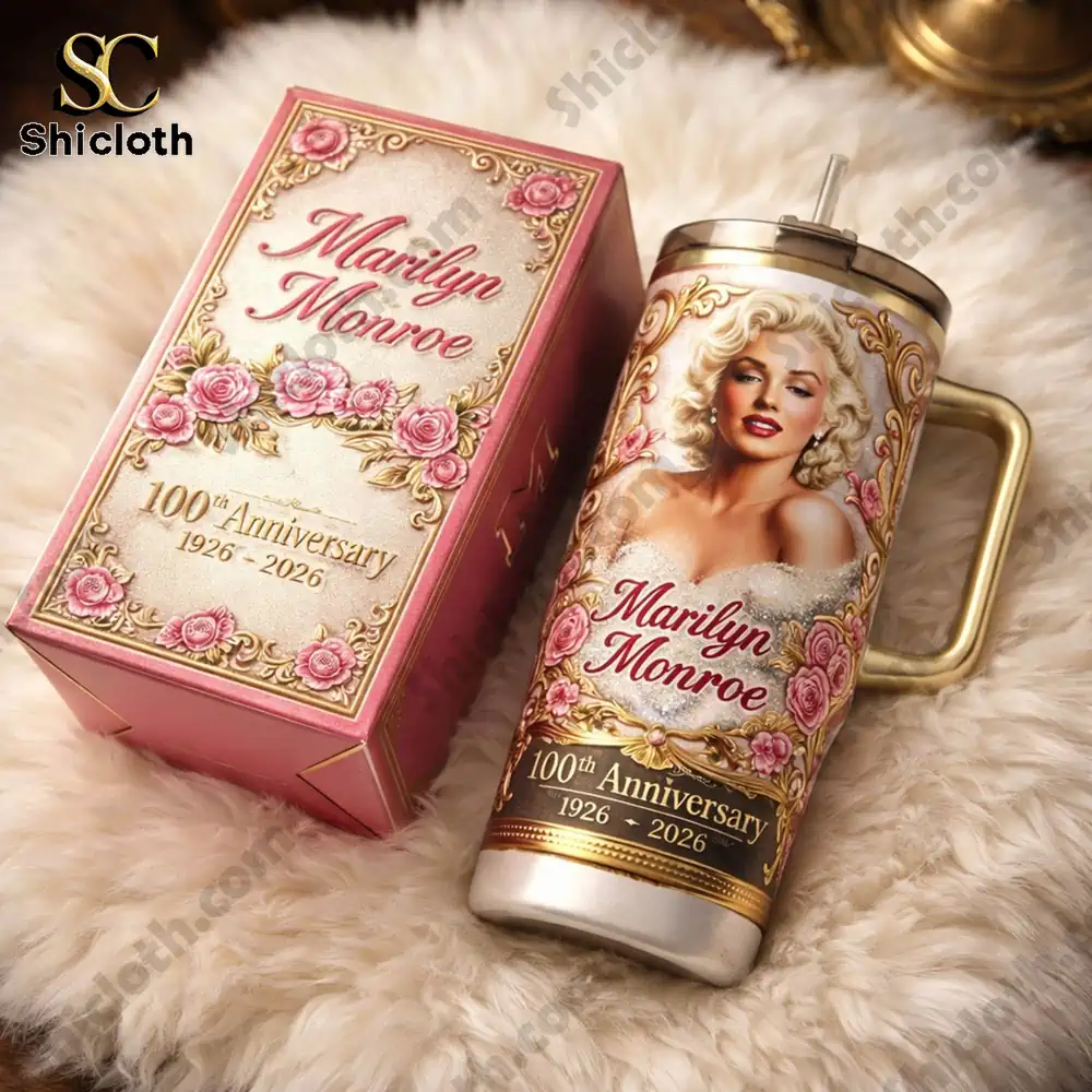 This premium tumbler features a pearlescent white base adorned with a classic portrait of Marilyn Monroe, framed by intricate gold filigree borders and pink 3D-effect roses. The central text “Marilyn Monroe” is written in a graceful pink script, while the bottom section proudly displays the “100th Anniversary 1926–2026” commemorative dates against a dark, contrasting band. Every detail, from the delicate floral patterns to the sturdy gold-finished handle, is designed to feel luxurious. The set comes with a matching decorative box, making it a perfect gift for birthdays or housewarming events.