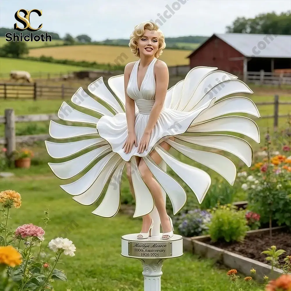 This beautifully crafted Marilyn Monroe statue is a special edition piece to celebrate a 100th anniversary (with text on the base specifically detailing her life, spanning from 1926-2026). It captures the essence of Marilyn in her iconic white halter-top dress, which billows and swirls not just from a breeze, but also through an innovative, stylized design where the dress itself is the fan. Her pose is classic: smiling confidently, hair perfectly coiffed, hands delicately placed as her skirt “catches the air.” This is not just a garden ornament; it’s a small-scale, detailed tribute to a timeless icon that adds immediate sophistication to any landscaping.