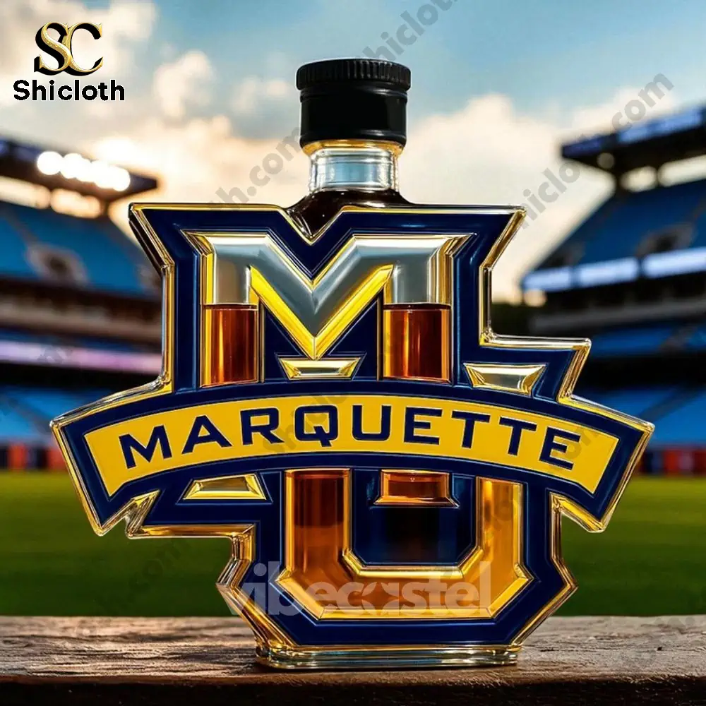 Talk about an eye-catcher! The bottle is shaped distinctly like the iconic Marquette “MU” shield logo. The main body features the True Blue color beautifully complemented by bold Gold accents, the school’s colors since 1892! The large “MU” is recessed, allowing the amber liquid inside to create a dramatic, two-toned effect—a stroke of genius design. A yellow banner with the word “MARQUETTE” in blue crosses the center, ensuring the school name is unmissable. The entire design is outlined in a glossy gold trim, making the bottle look like a championship trophy itself.